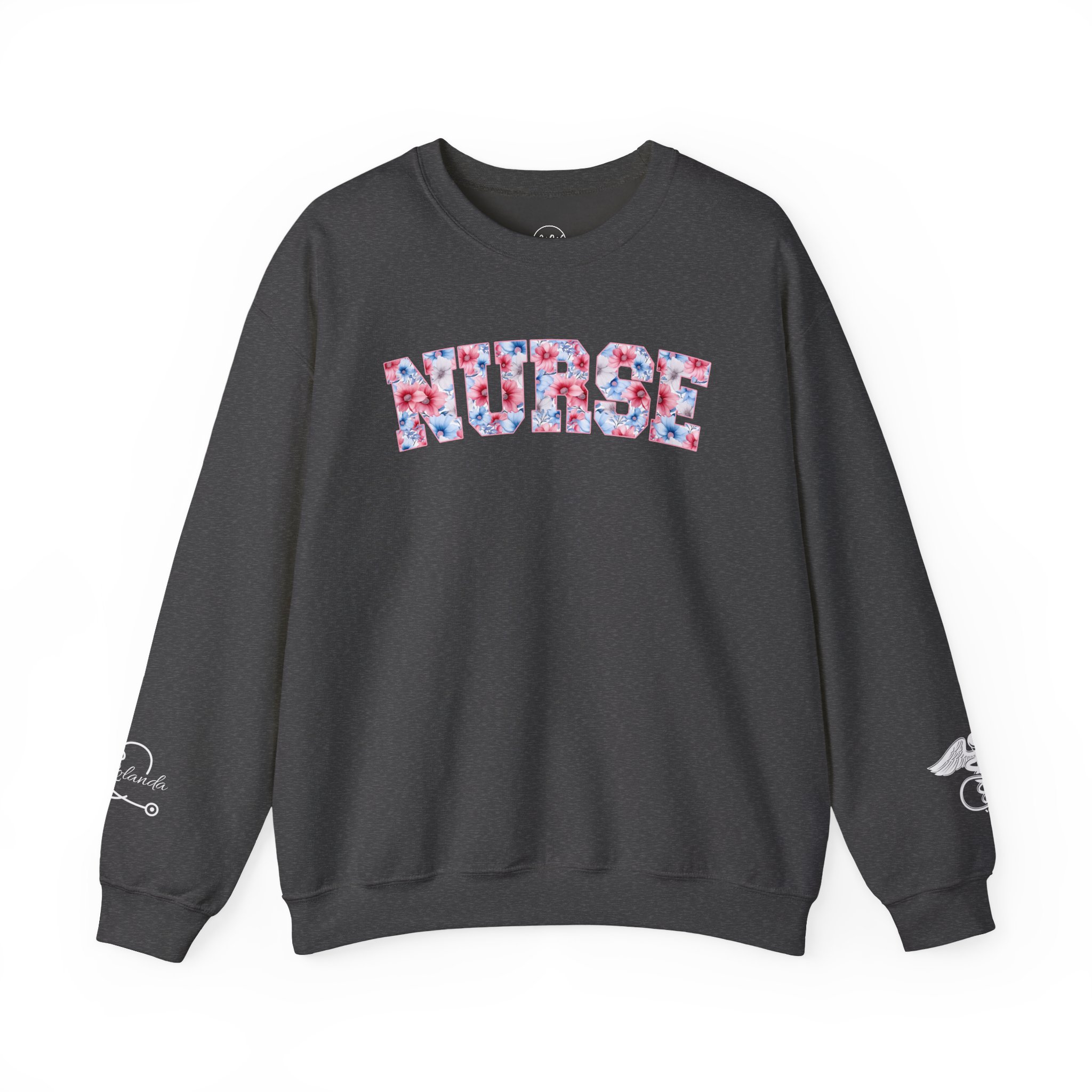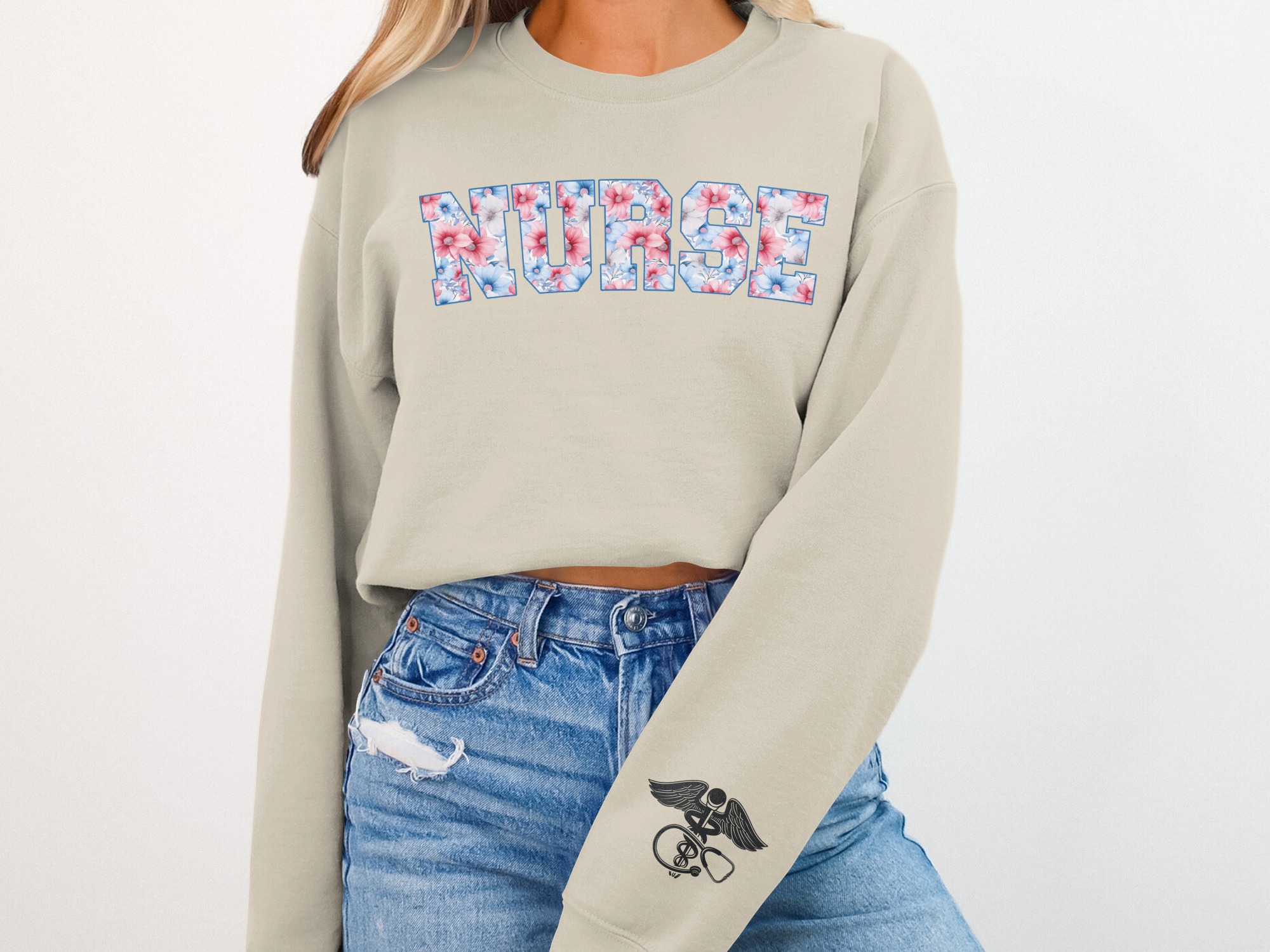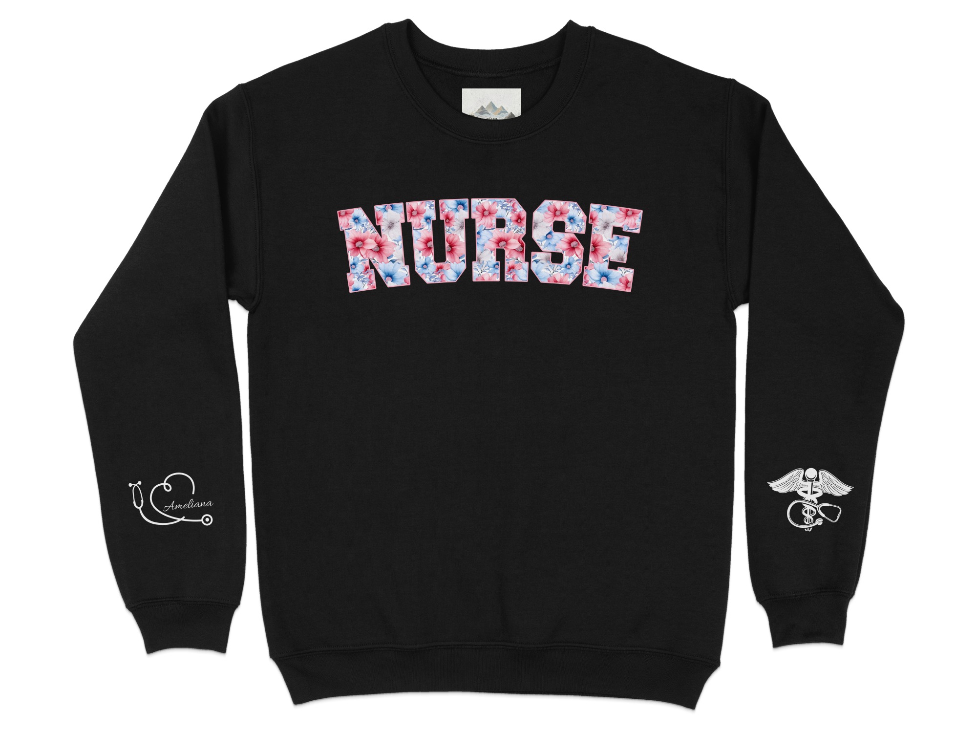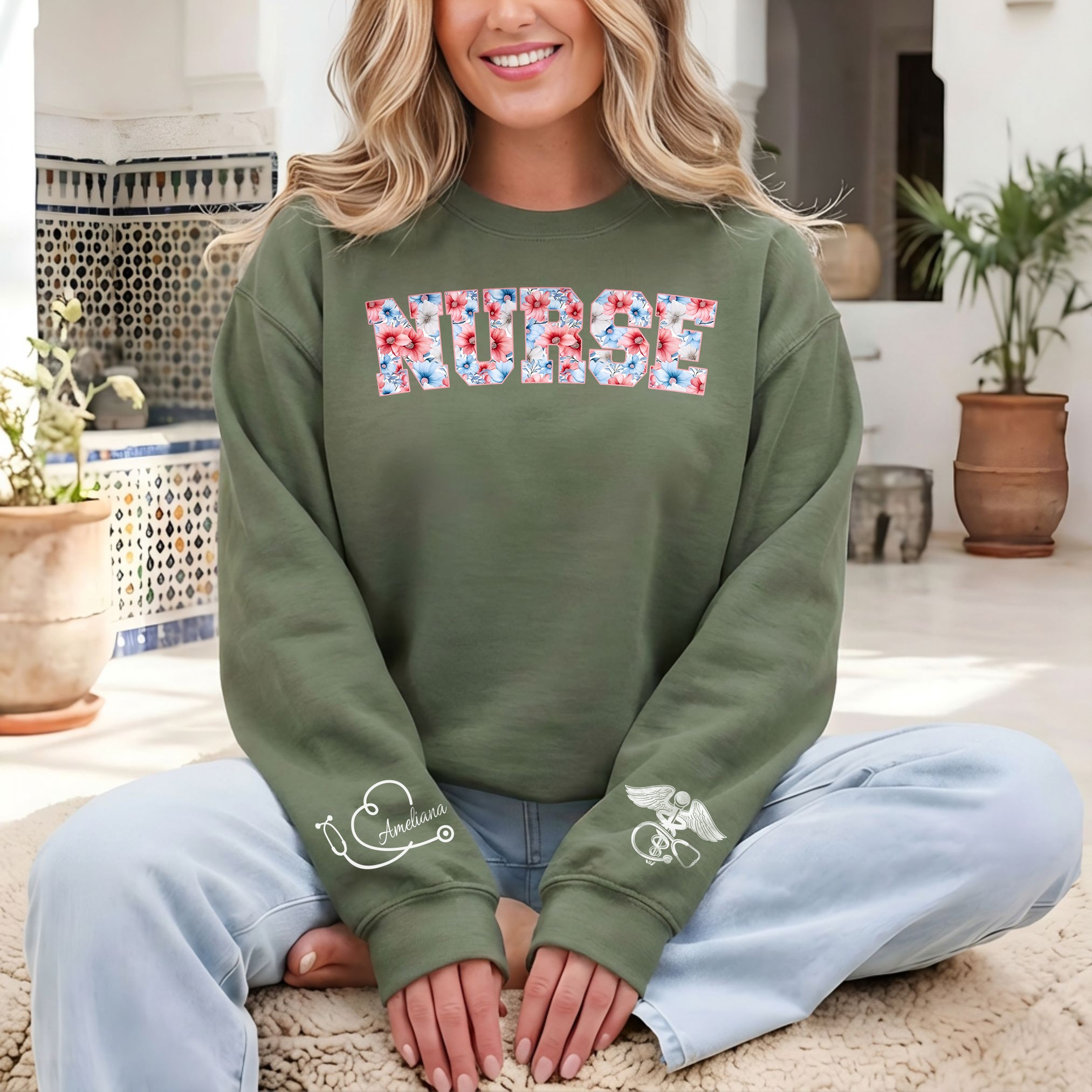 Soft, roomy, and quietly confident — this crewneck wraps long shifts and slow mornings in a calm, wearable hug. The slightly oversized cut and durable 50/50 cotton-poly fabric feel lived-in without losing shape. A floral-patterned “NURSE” across the chest adds a gentle, personal touch, while subtle sleeve prints peek out at the cuffs for a little surprise on every gesture. It’s the sort of sweatshirt that moves from charting stations to coffee runs with ease — breathable, low-itch, and built to keep up with long days and heartfelt moments.