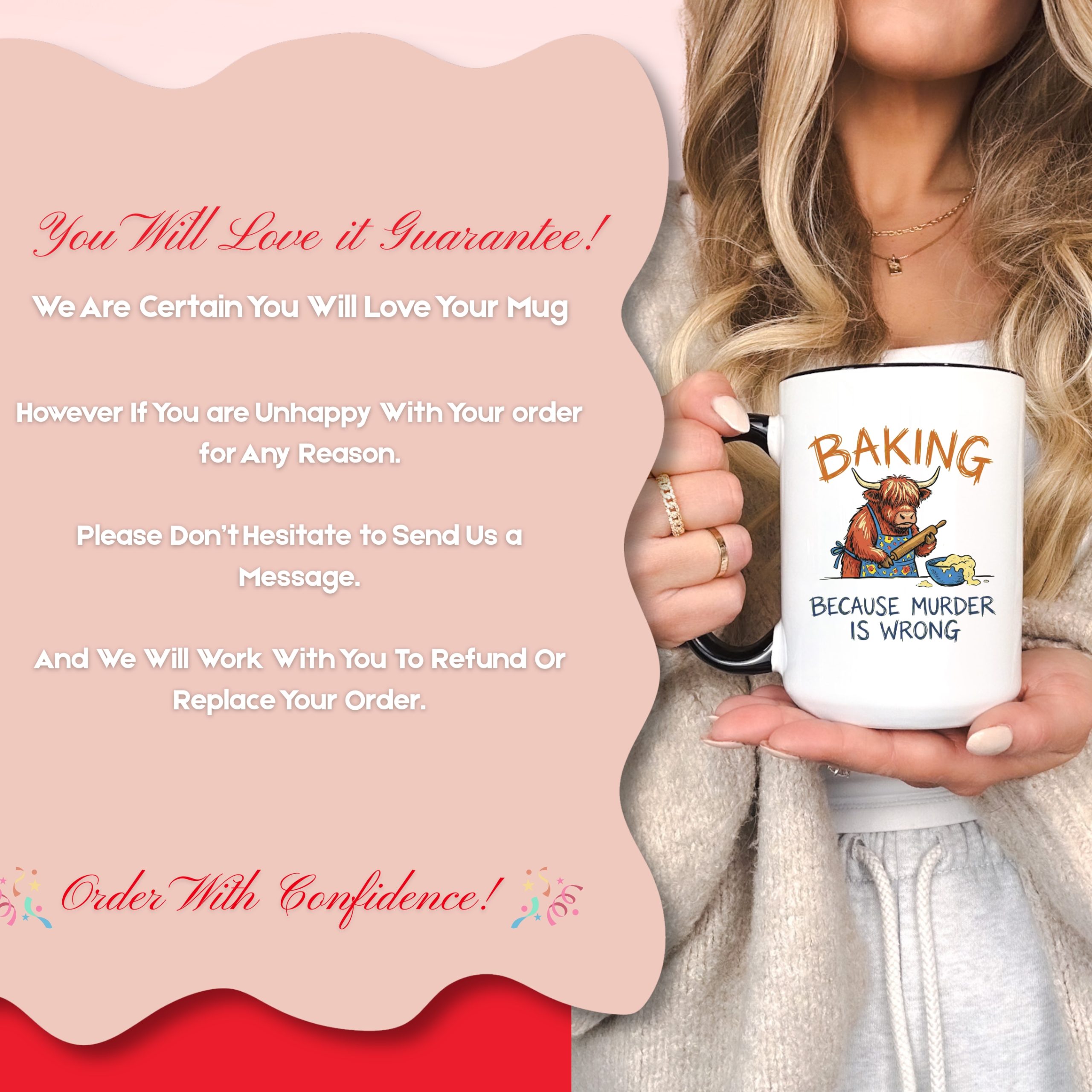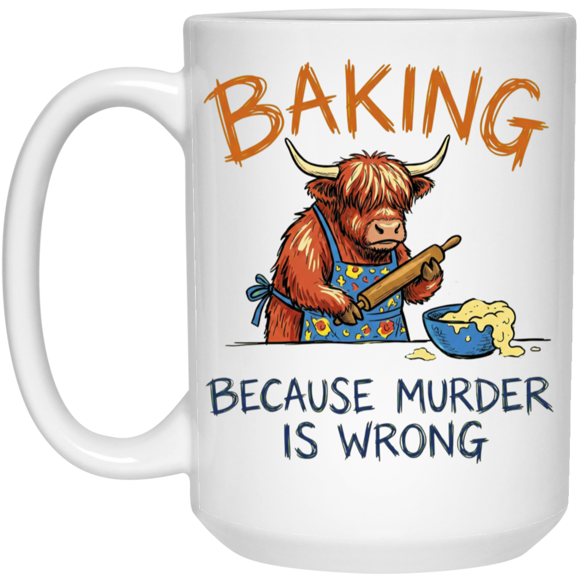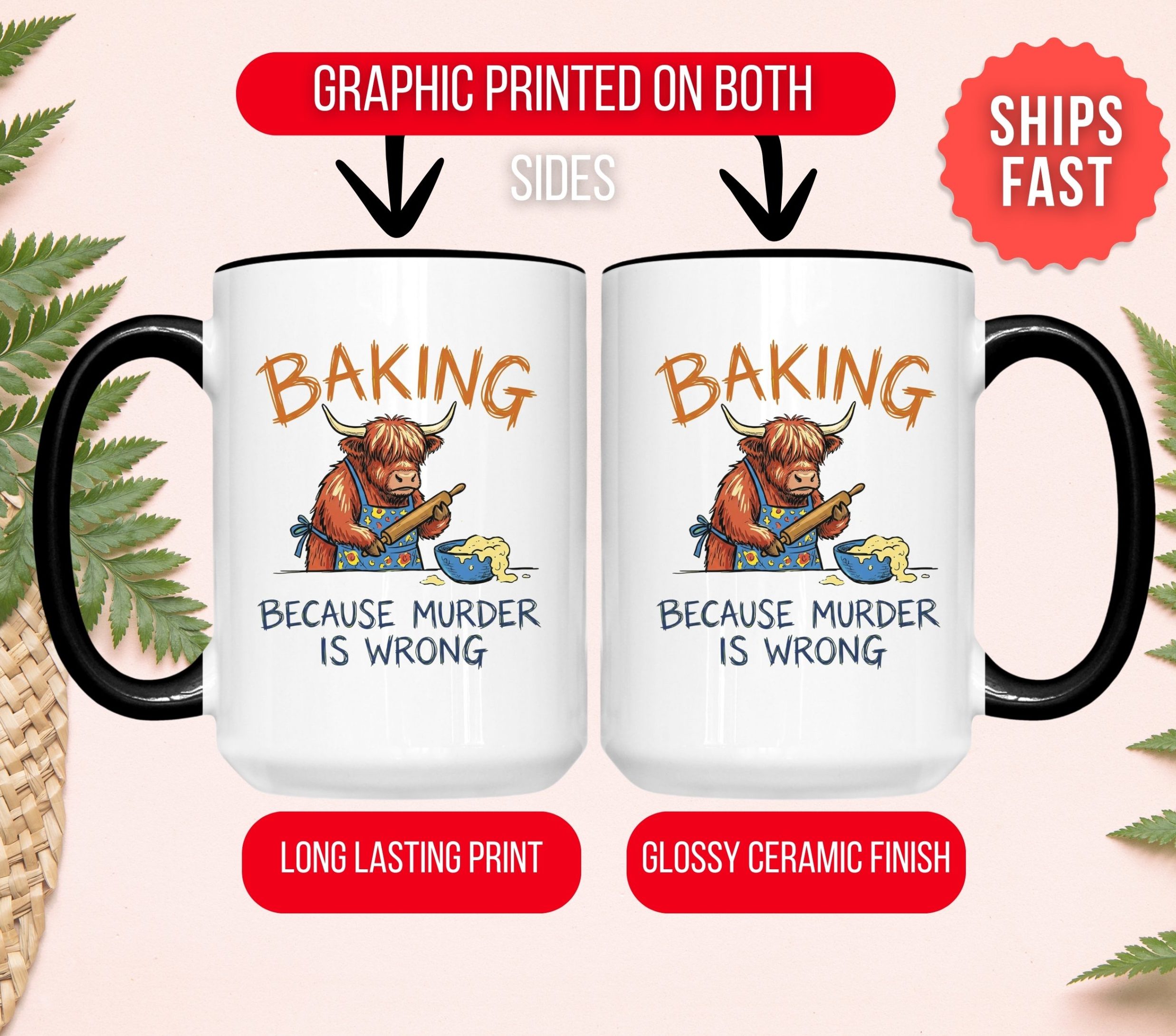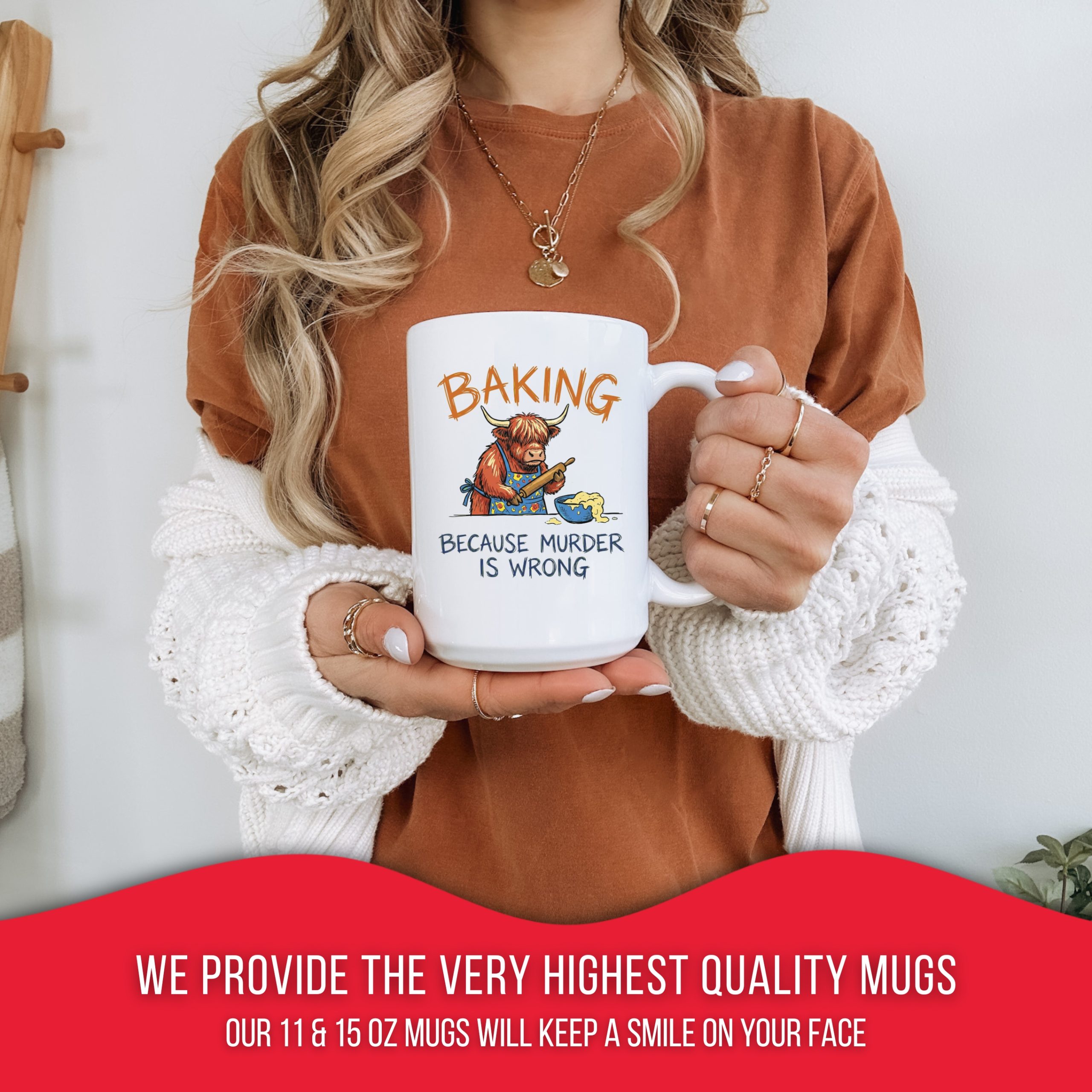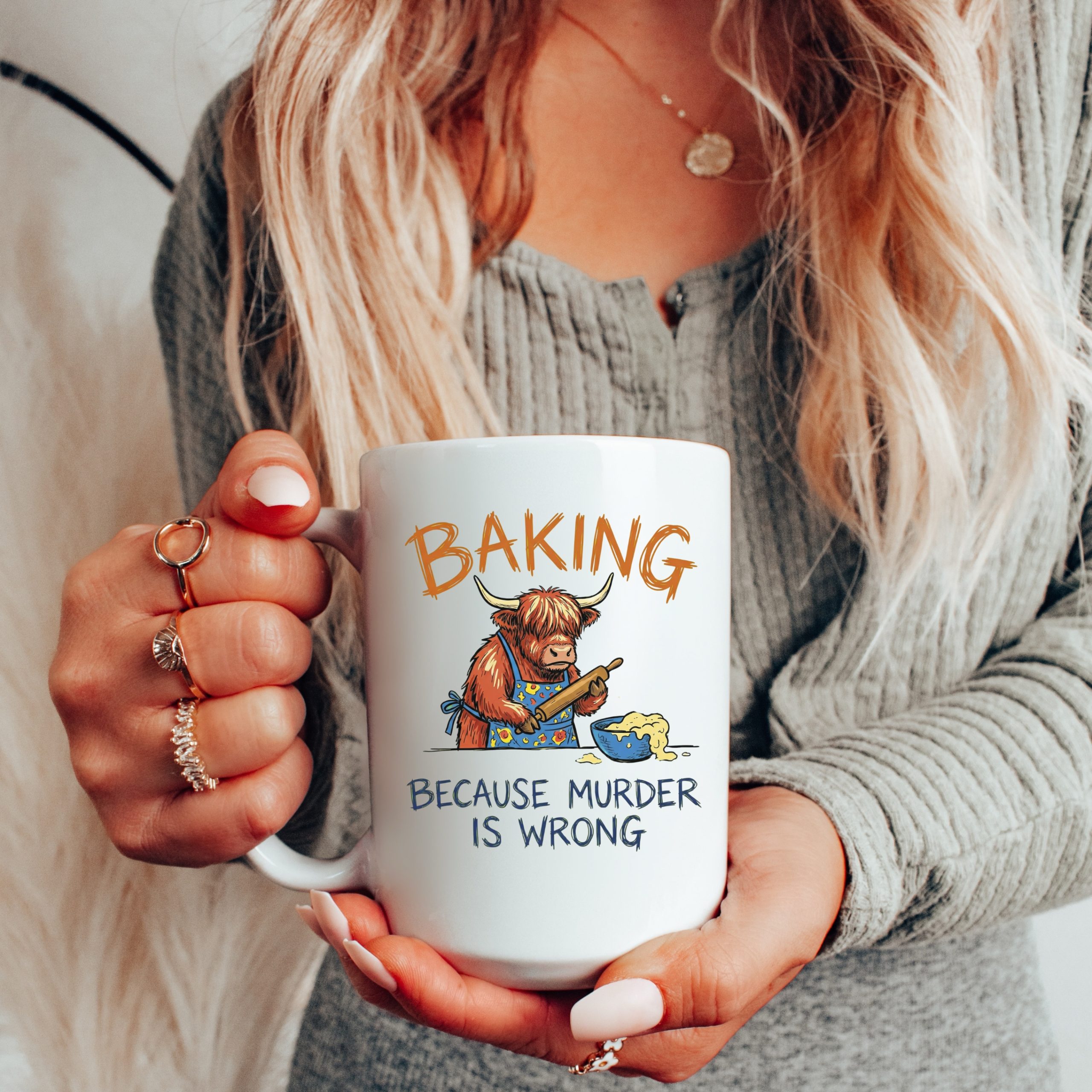 Let’s face it: sometimes the only thing stopping you from snapping is a rolling pin and some fresh dough. This hilarious “Baking Because Murder Is Wrong” mug features a grumpy yet lovable Highland Cow working through some issues in the kitchen. It is the ultimate statement piece for anyone who finds their sanity in the oven.