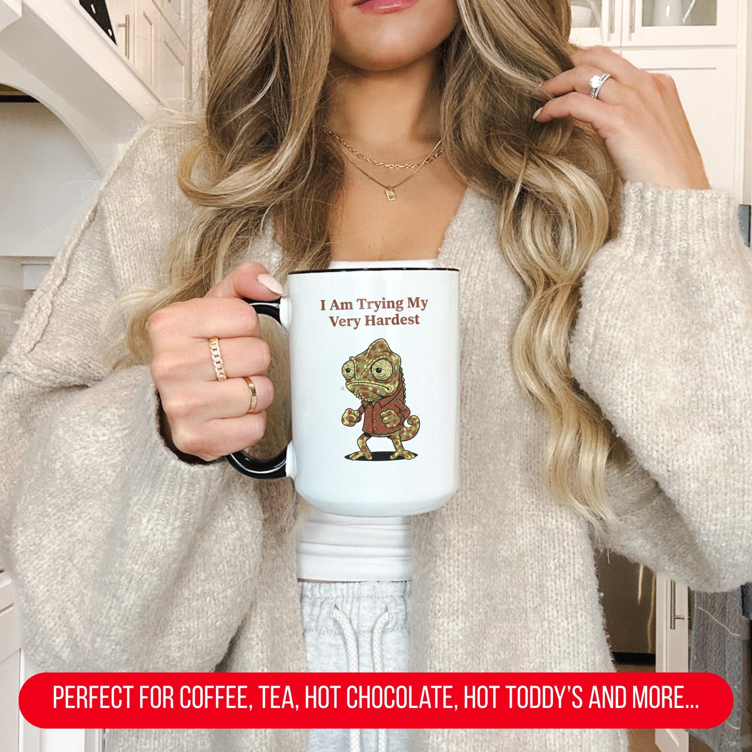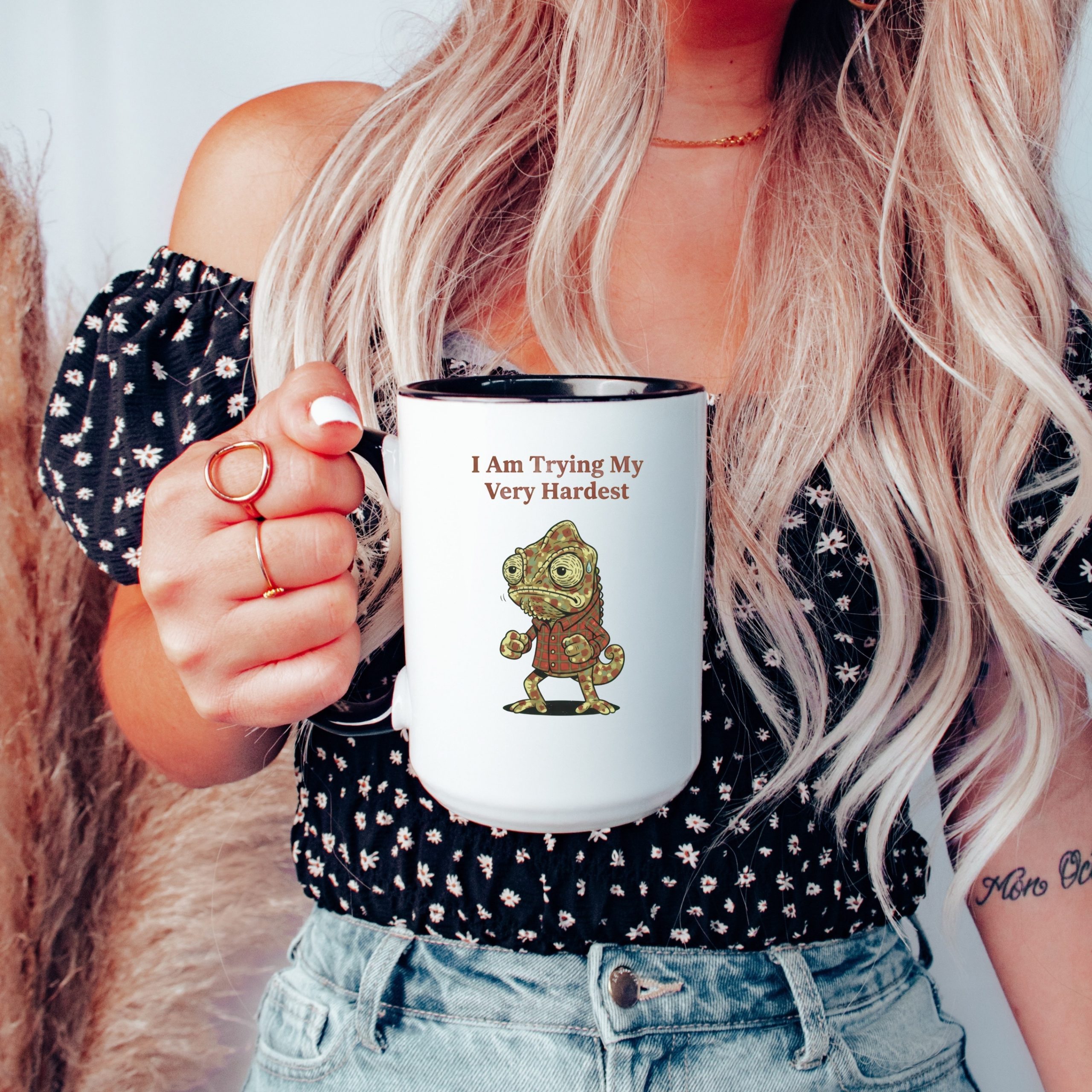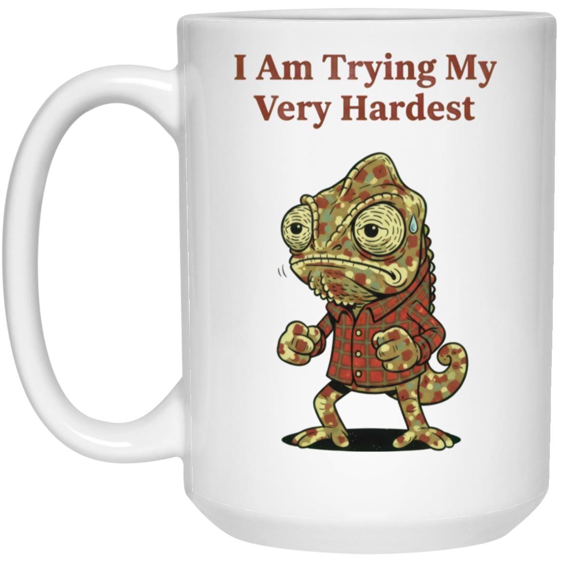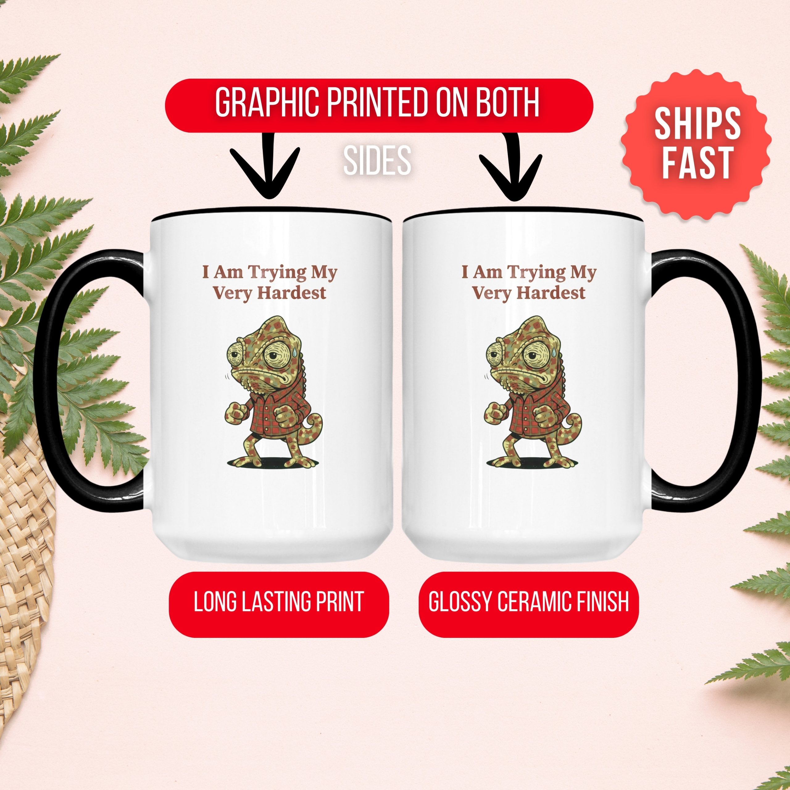 Look, we can’t all be high-functioning social butterflies. Some of us are just like this I Am Trying My Very Hardest Chameleon—clinging to the branch of sanity while wearing a flannel shirt and hoping nobody notices the eye twitch. If your current vibe is “barely holding it together but still showing up,” this mug is your new spirit animal.