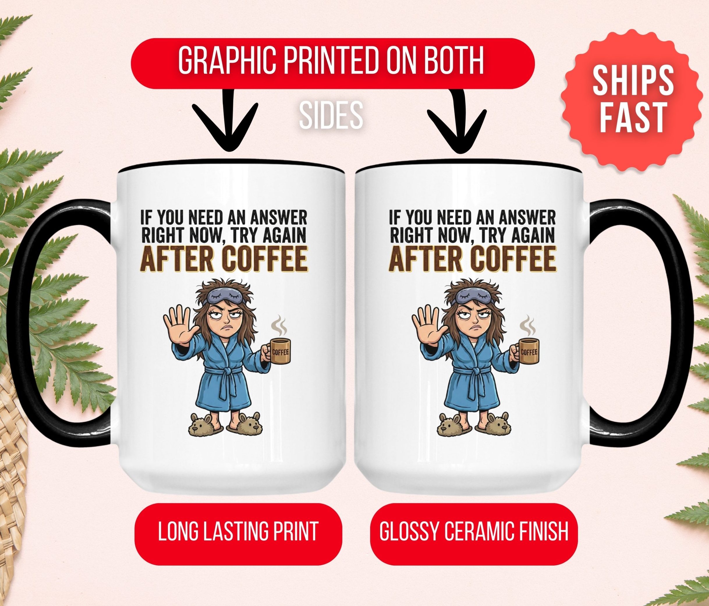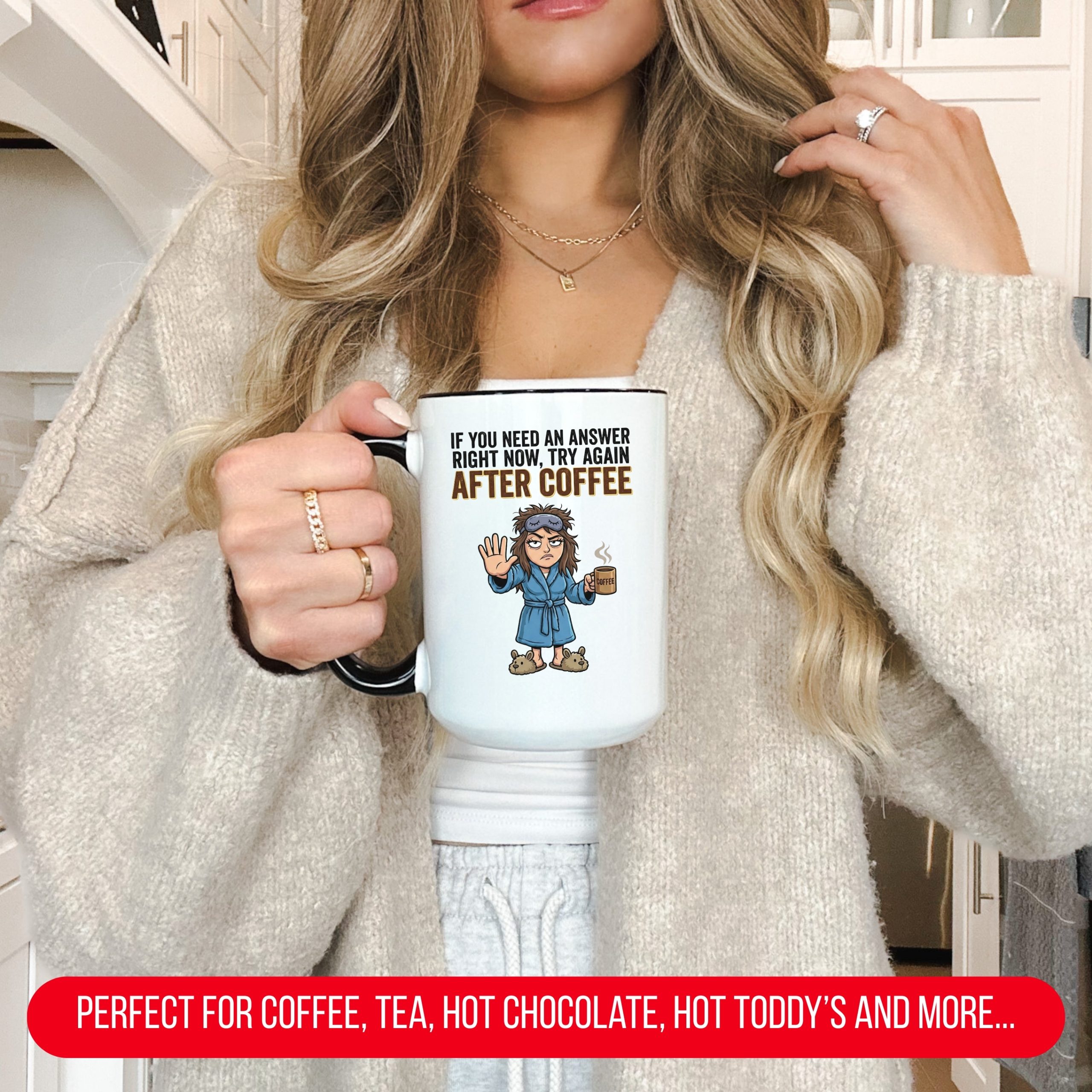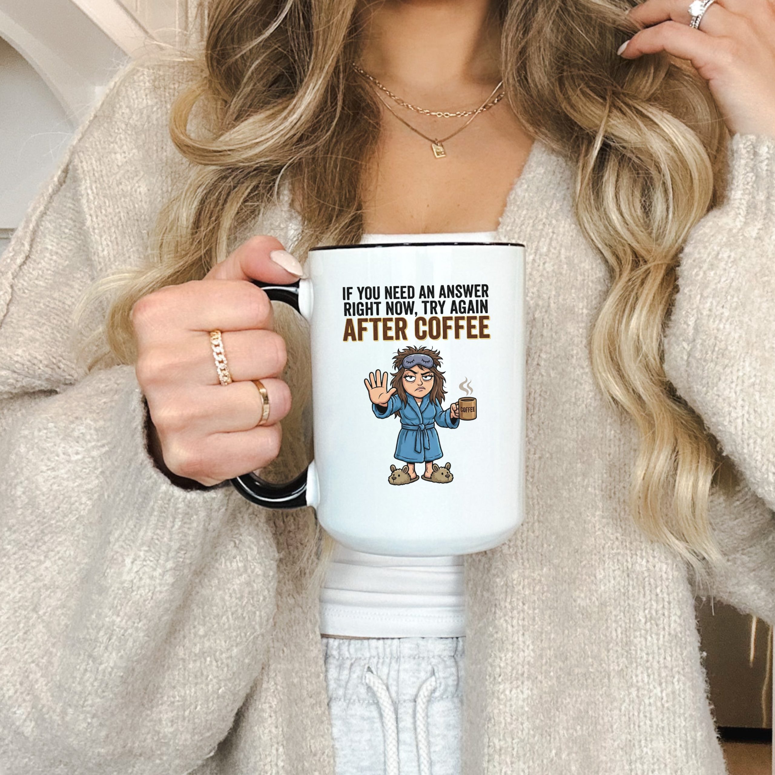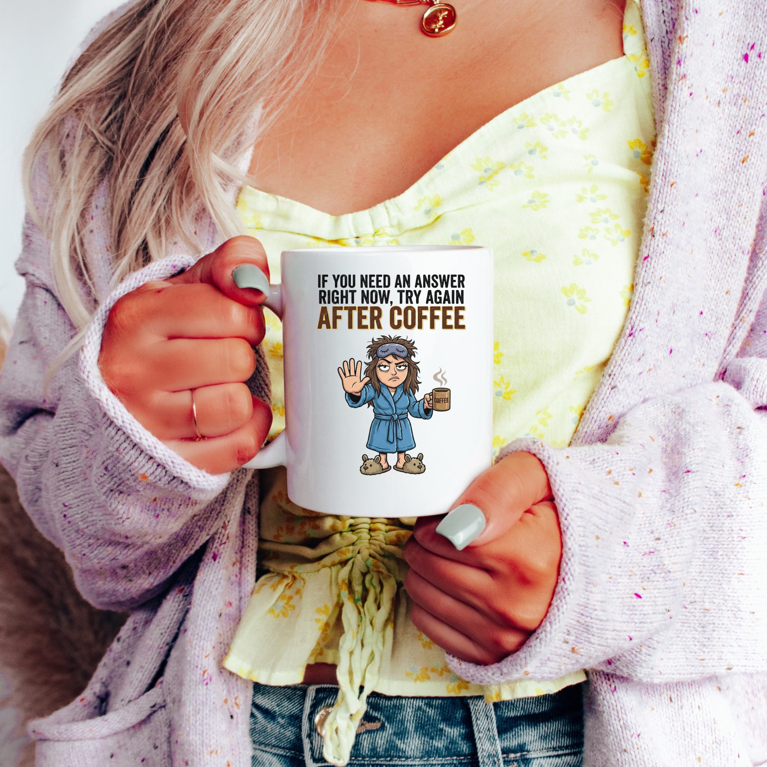 Mornings are not the time for questions 😅 This funny coffee mug reads: “If you need an answer right now, try again after coffee” and features a grumpy, sleep-deprived vibe (robe, slippers, bedhead, and a steaming cup) with a clear “talk to me later” message.
