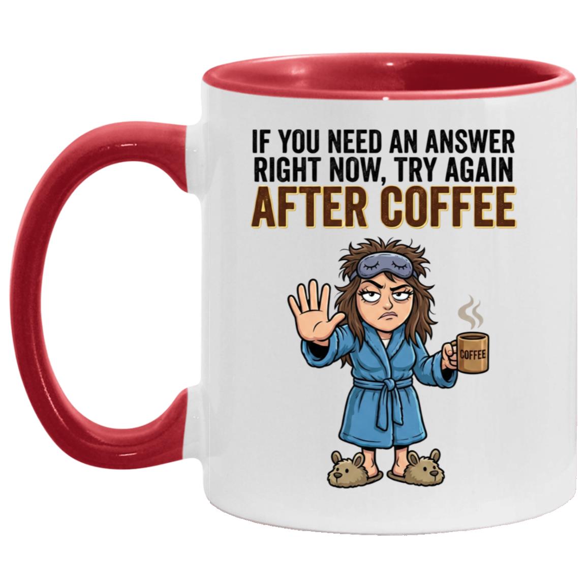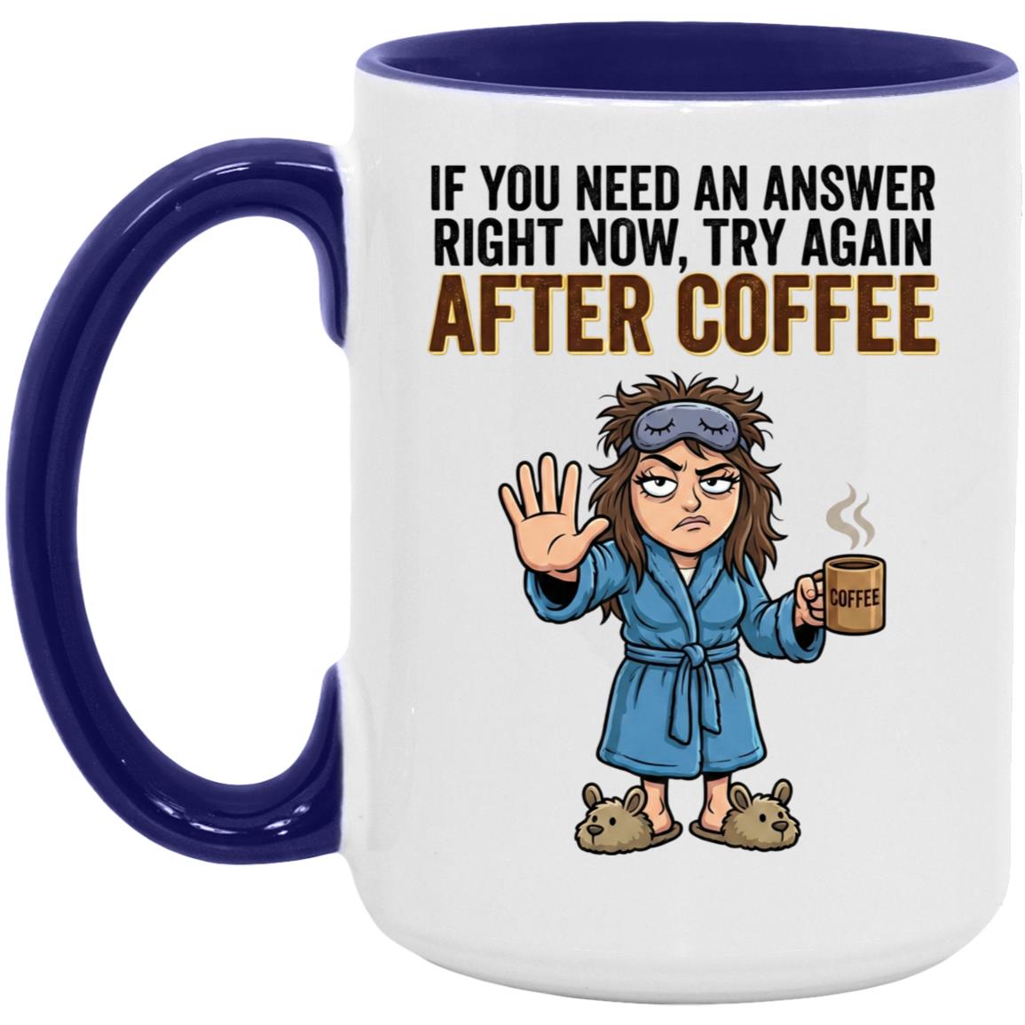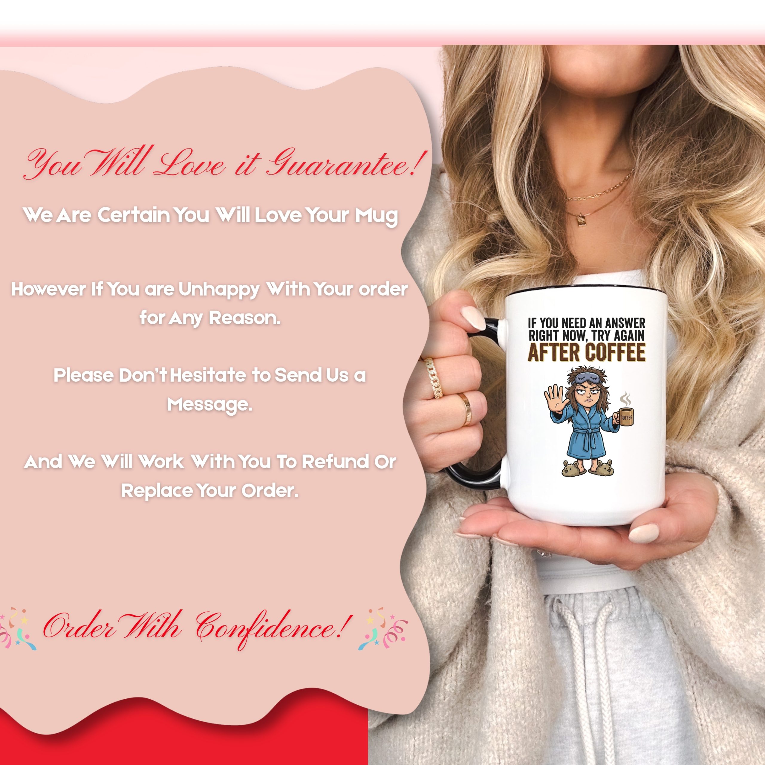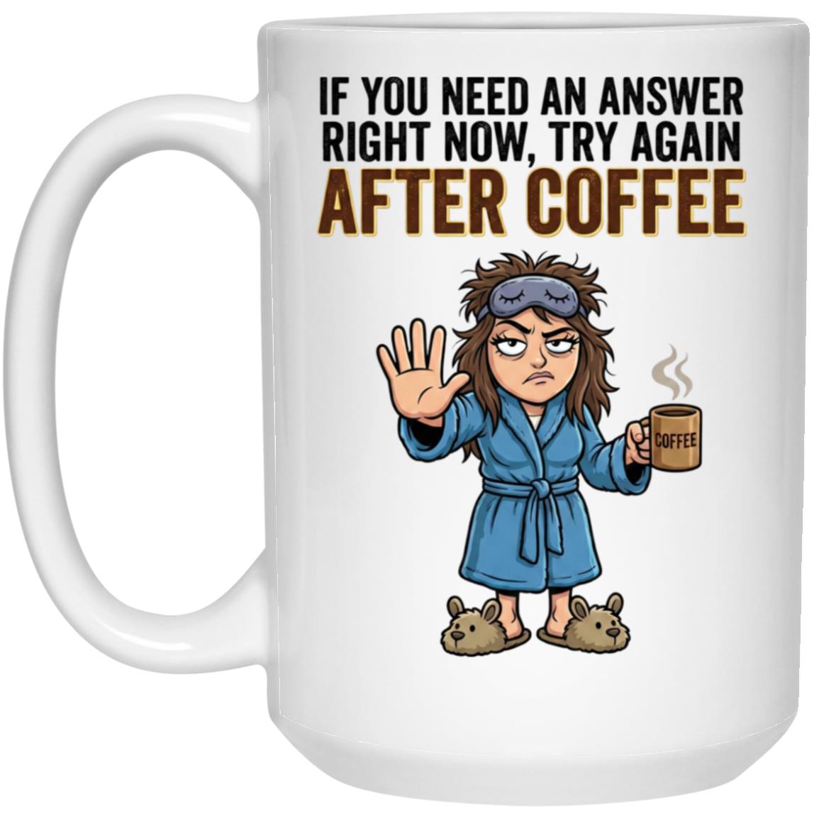 Mornings are not the time for questions 😅 This funny coffee mug reads: “If you need an answer right now, try again after coffee” and features a grumpy, sleep-deprived vibe (robe, slippers, bedhead, and a steaming cup) with a clear “talk to me later” message.