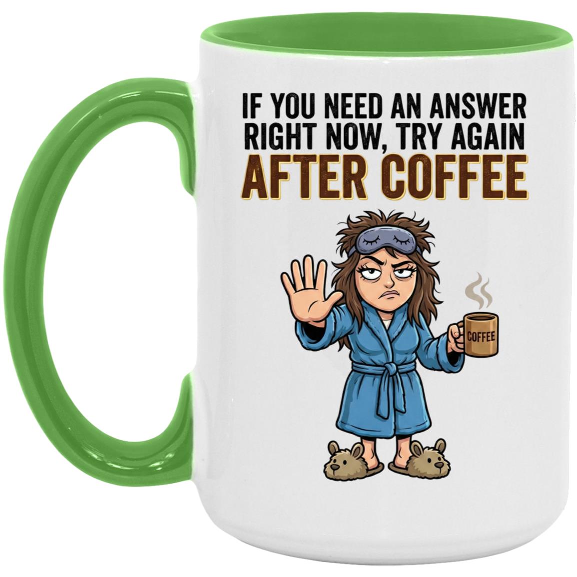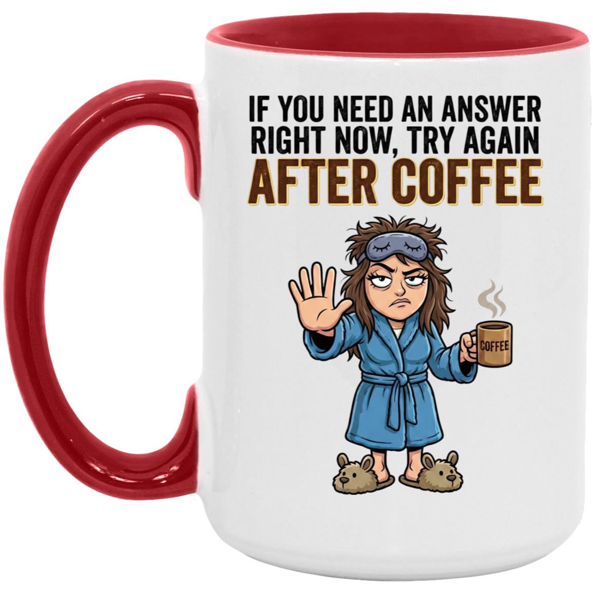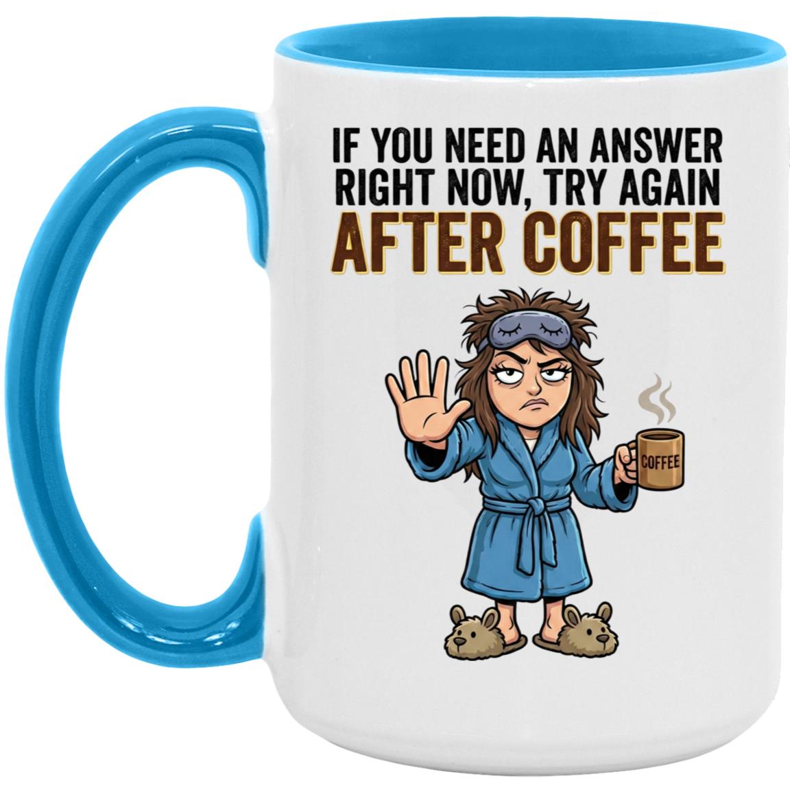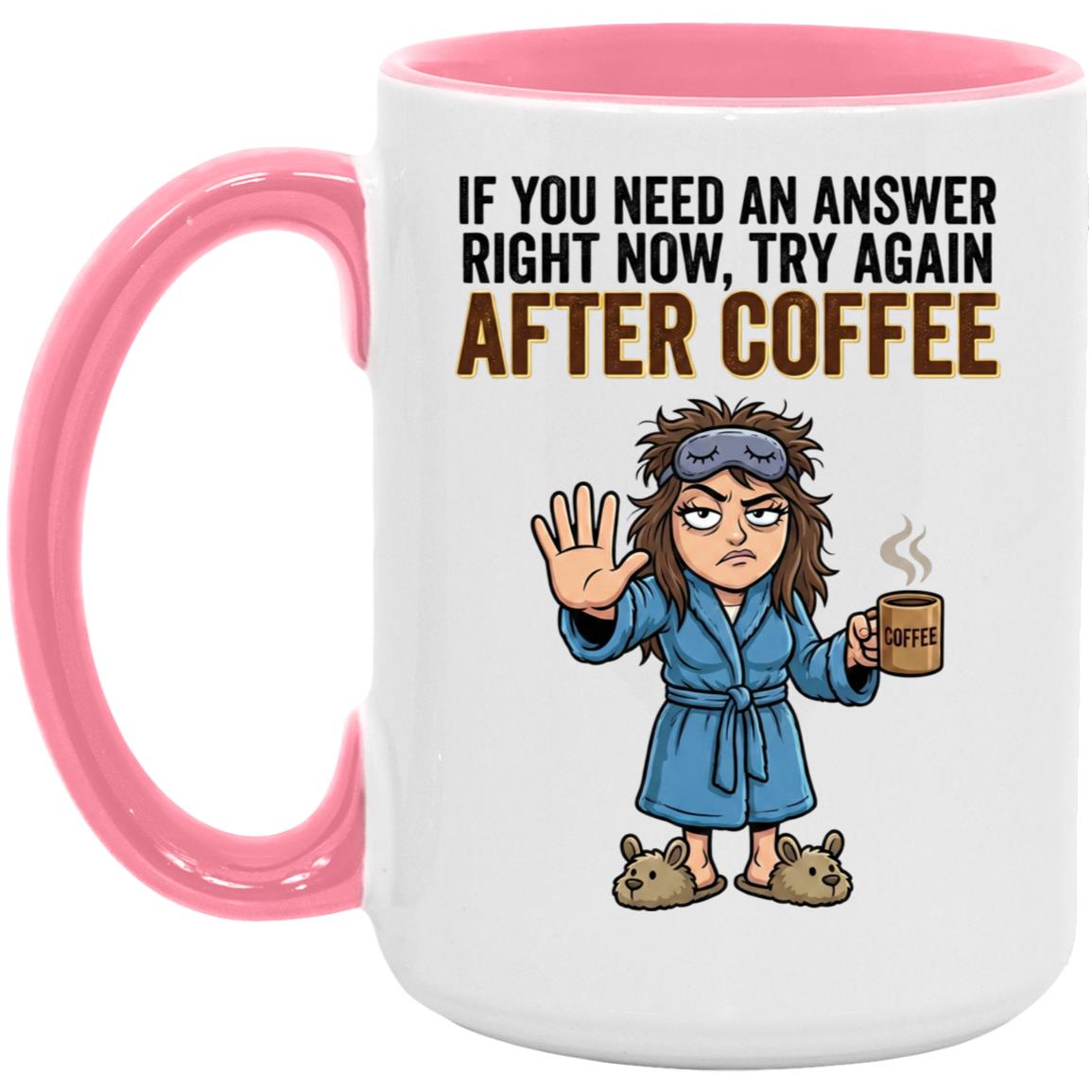 Mornings are not the time for questions 😅 This funny coffee mug reads: “If you need an answer right now, try again after coffee” and features a grumpy, sleep-deprived vibe (robe, slippers, bedhead, and a steaming cup) with a clear “talk to me later” message.