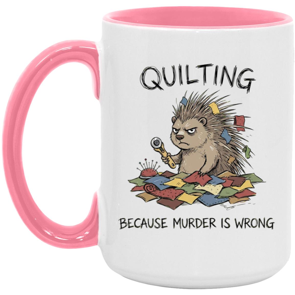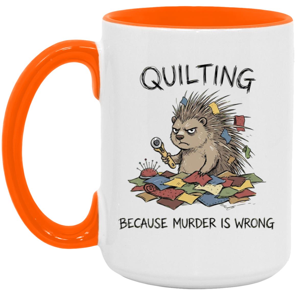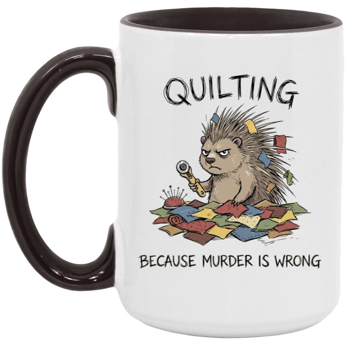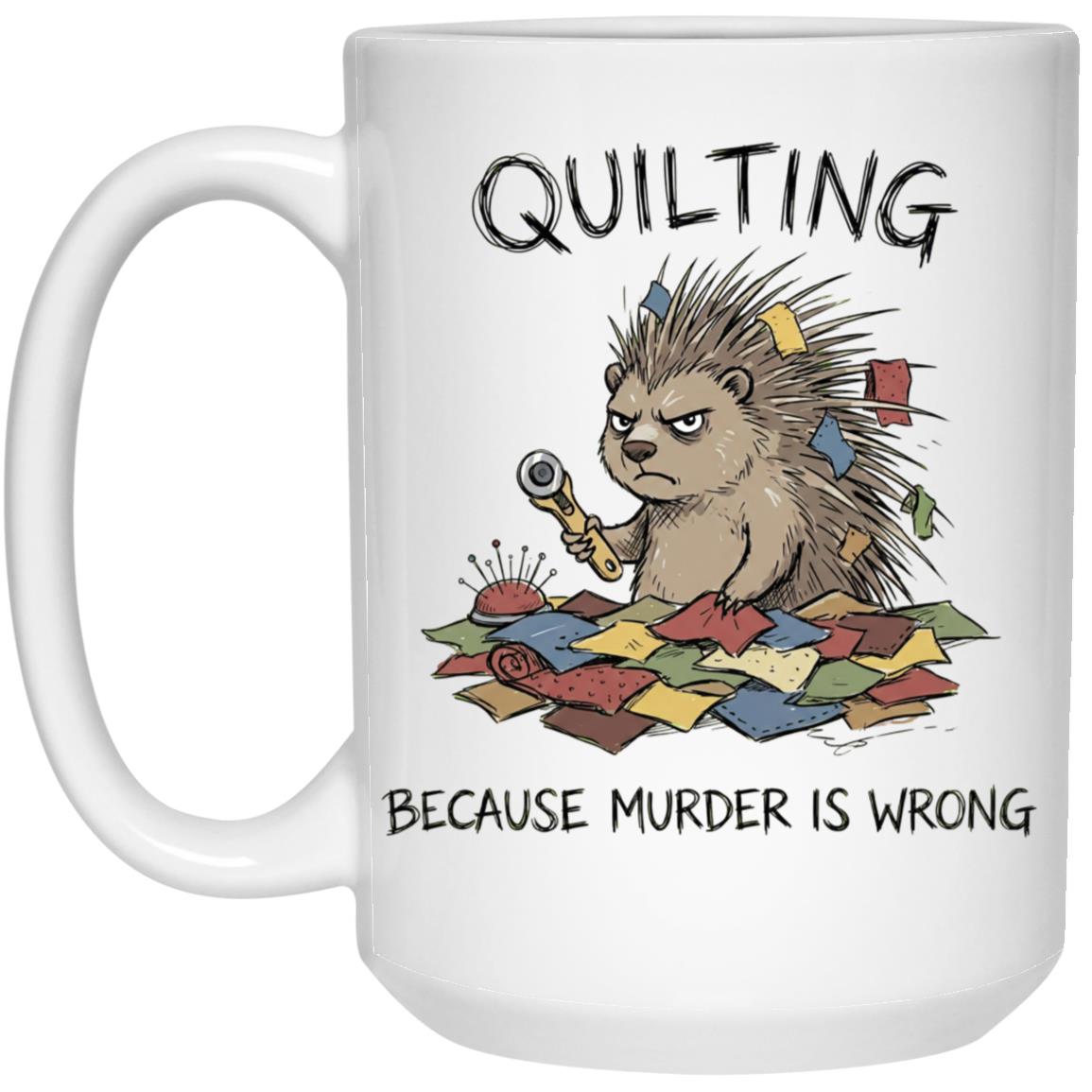 Quilting is cheaper than therapy… and apparently murder is wrong 😅 This hilarious quilting mug features a grumpy spiky “quilty” critter surrounded by fabric scraps, pins, and a rotary cutter—perfect for anyone who lives for patchwork, quilt blocks, and a well-organized sewing room.