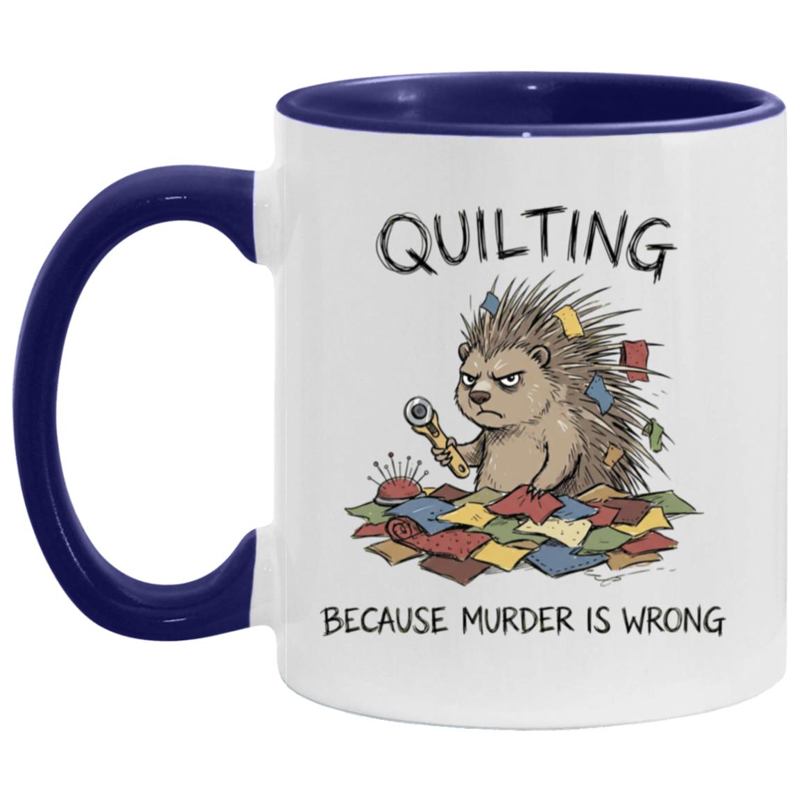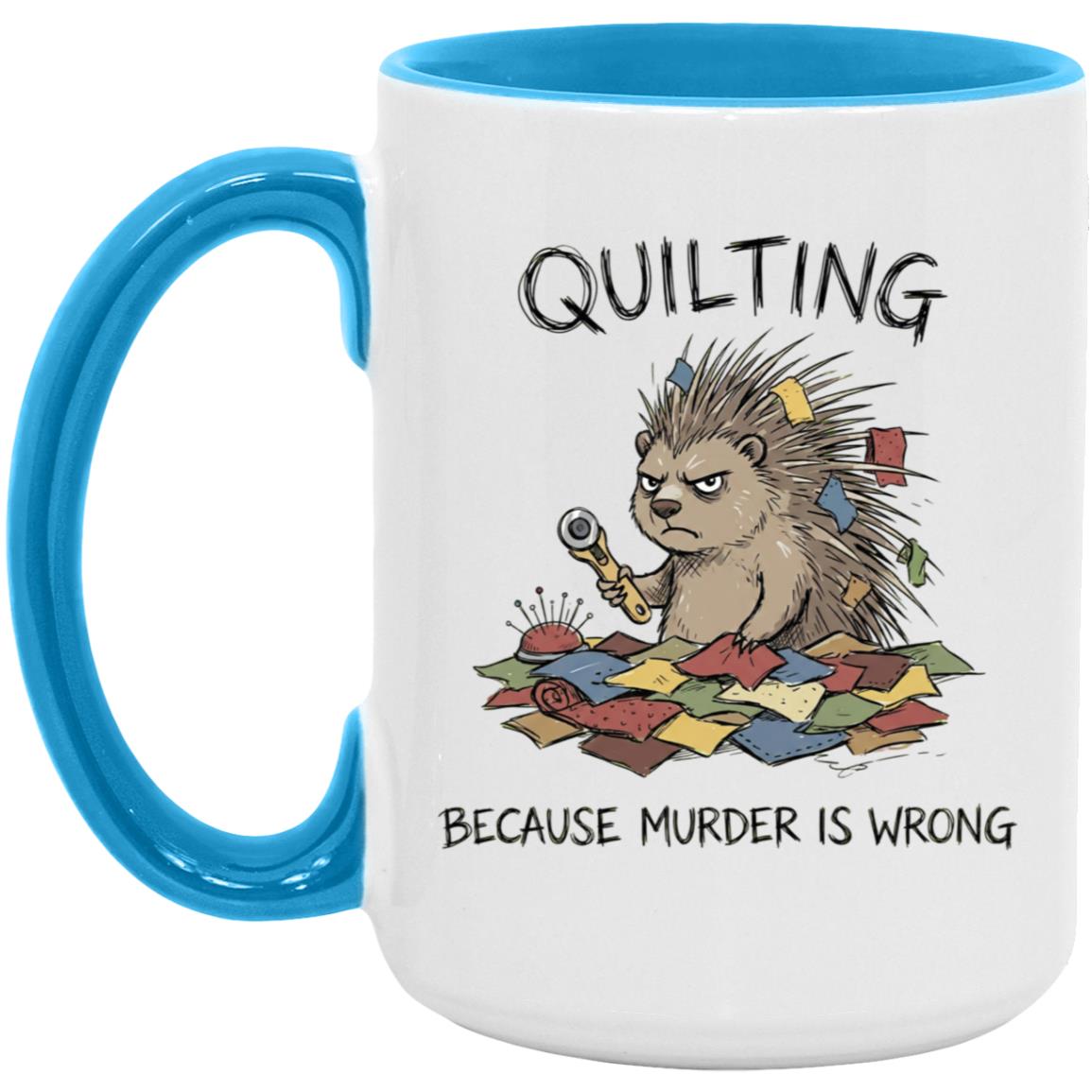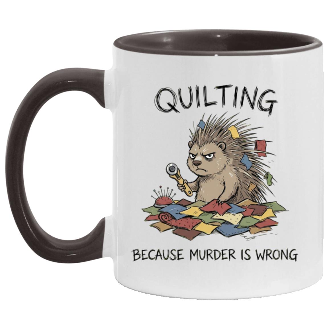 Quilting is cheaper than therapy… and apparently murder is wrong 😅 This hilarious quilting mug features a grumpy spiky “quilty” critter surrounded by fabric scraps, pins, and a rotary cutter—perfect for anyone who lives for patchwork, quilt blocks, and a well-organized sewing room.