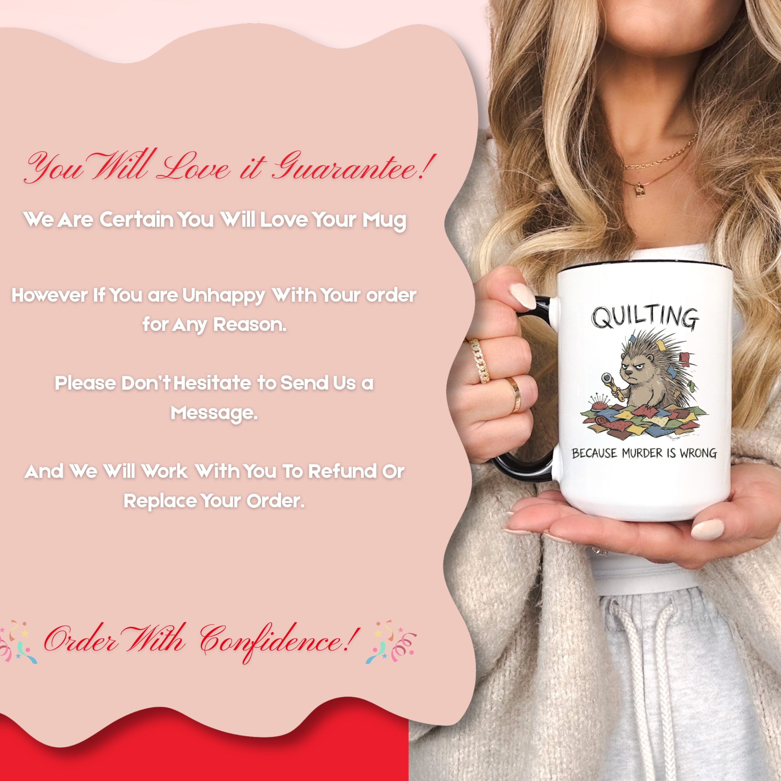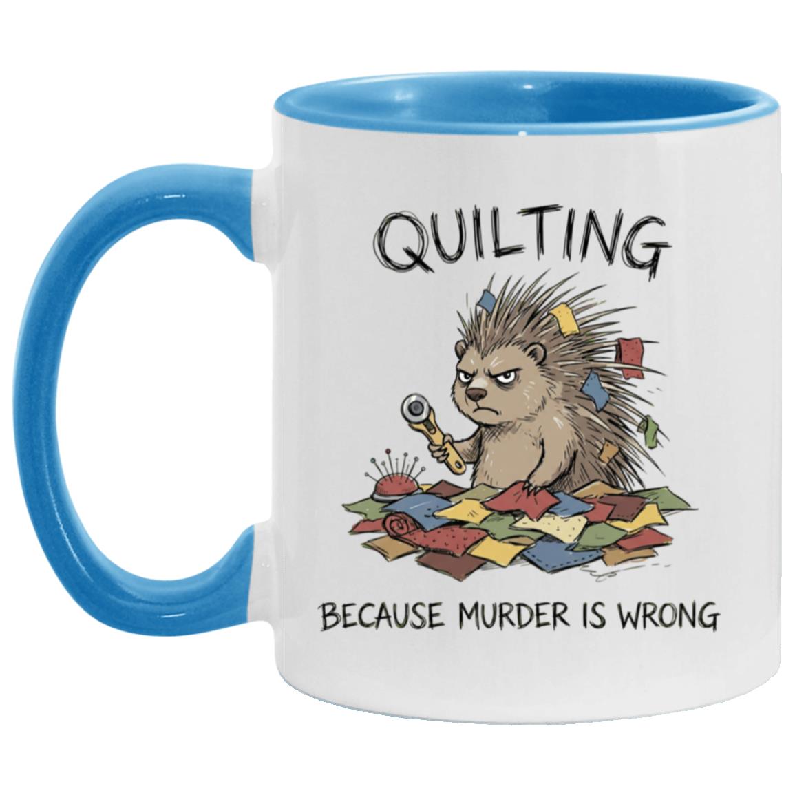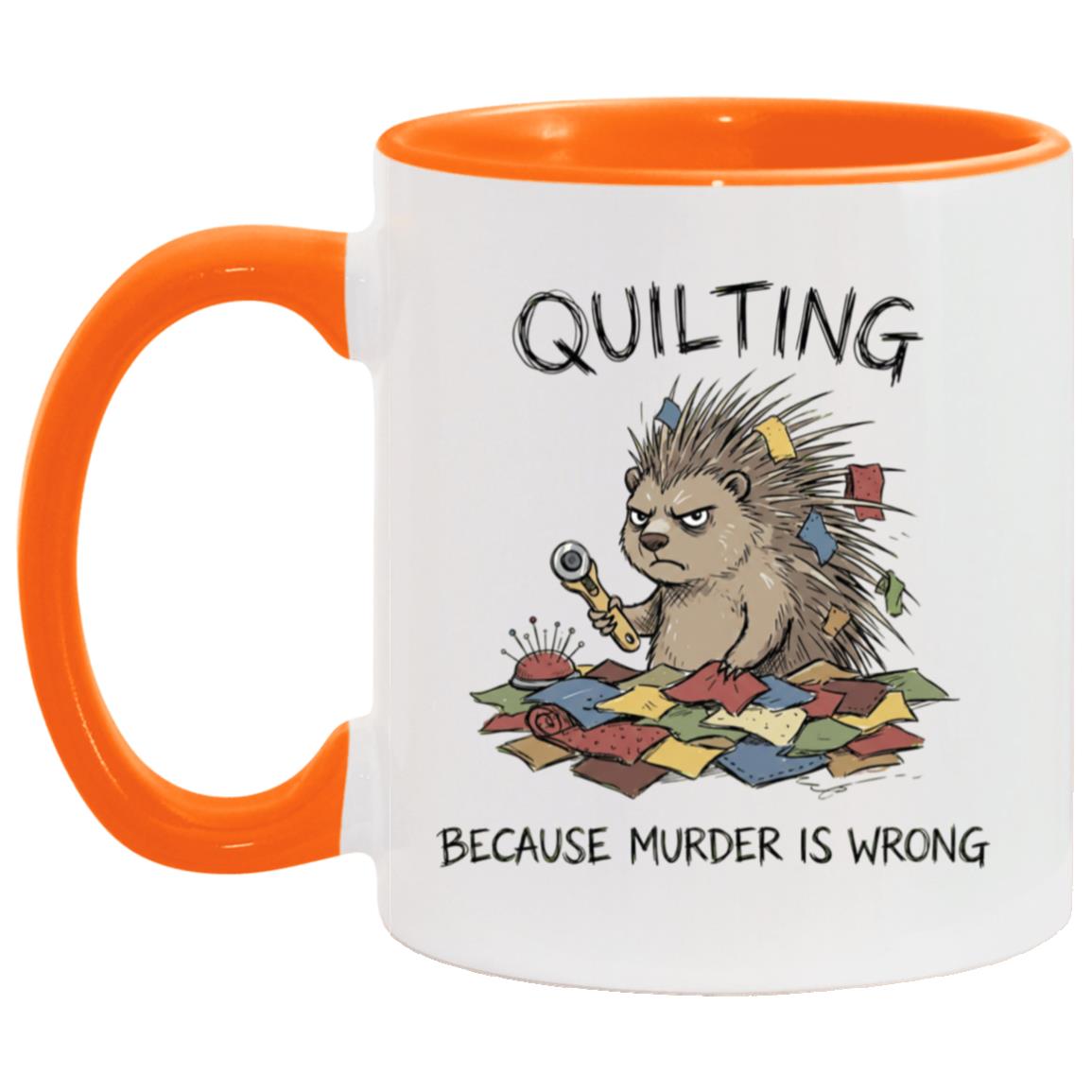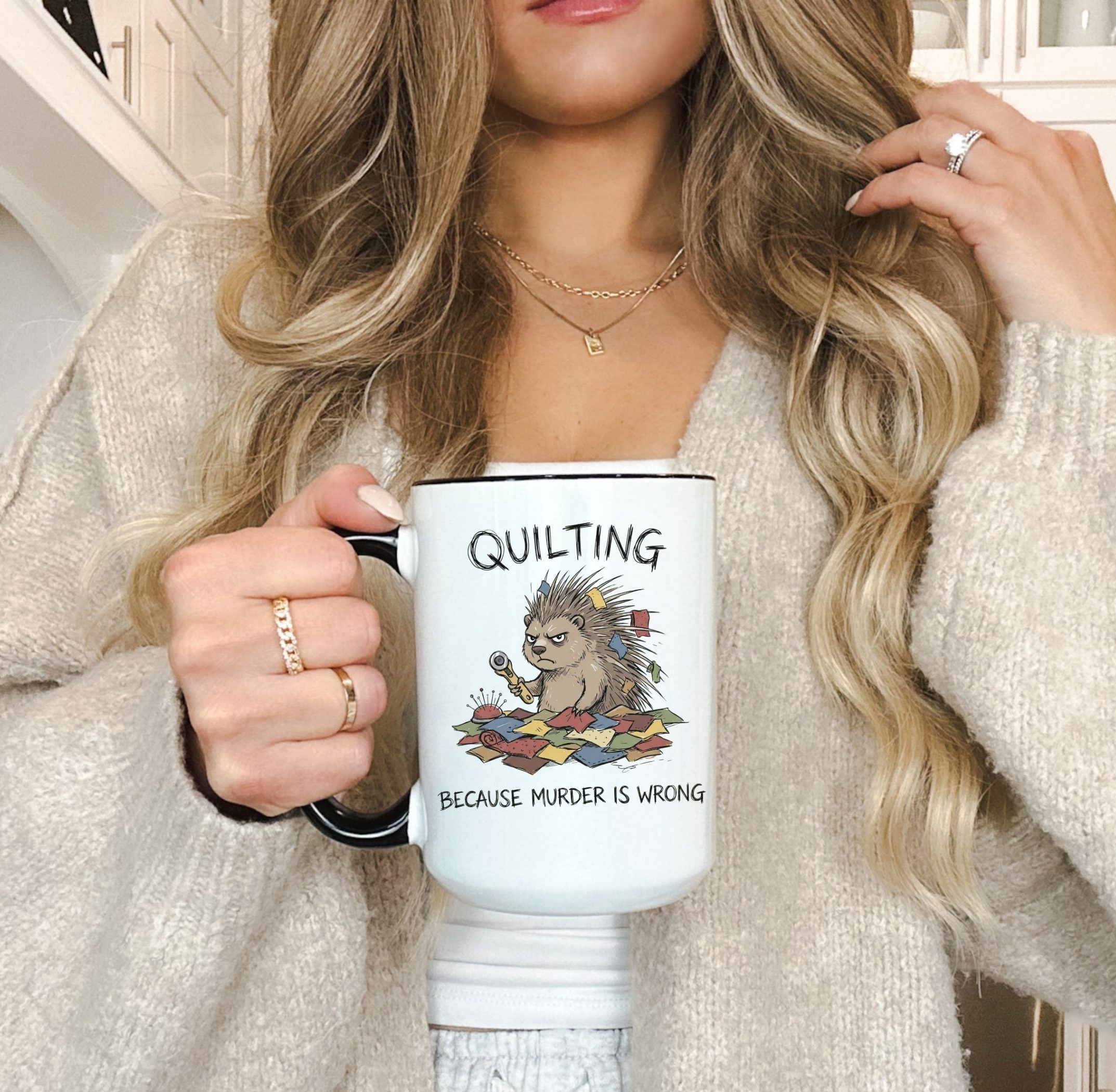 Quilting is cheaper than therapy… and apparently murder is wrong 😅 This hilarious quilting mug features a grumpy spiky “quilty” critter surrounded by fabric scraps, pins, and a rotary cutter—perfect for anyone who lives for patchwork, quilt blocks, and a well-organized sewing room.