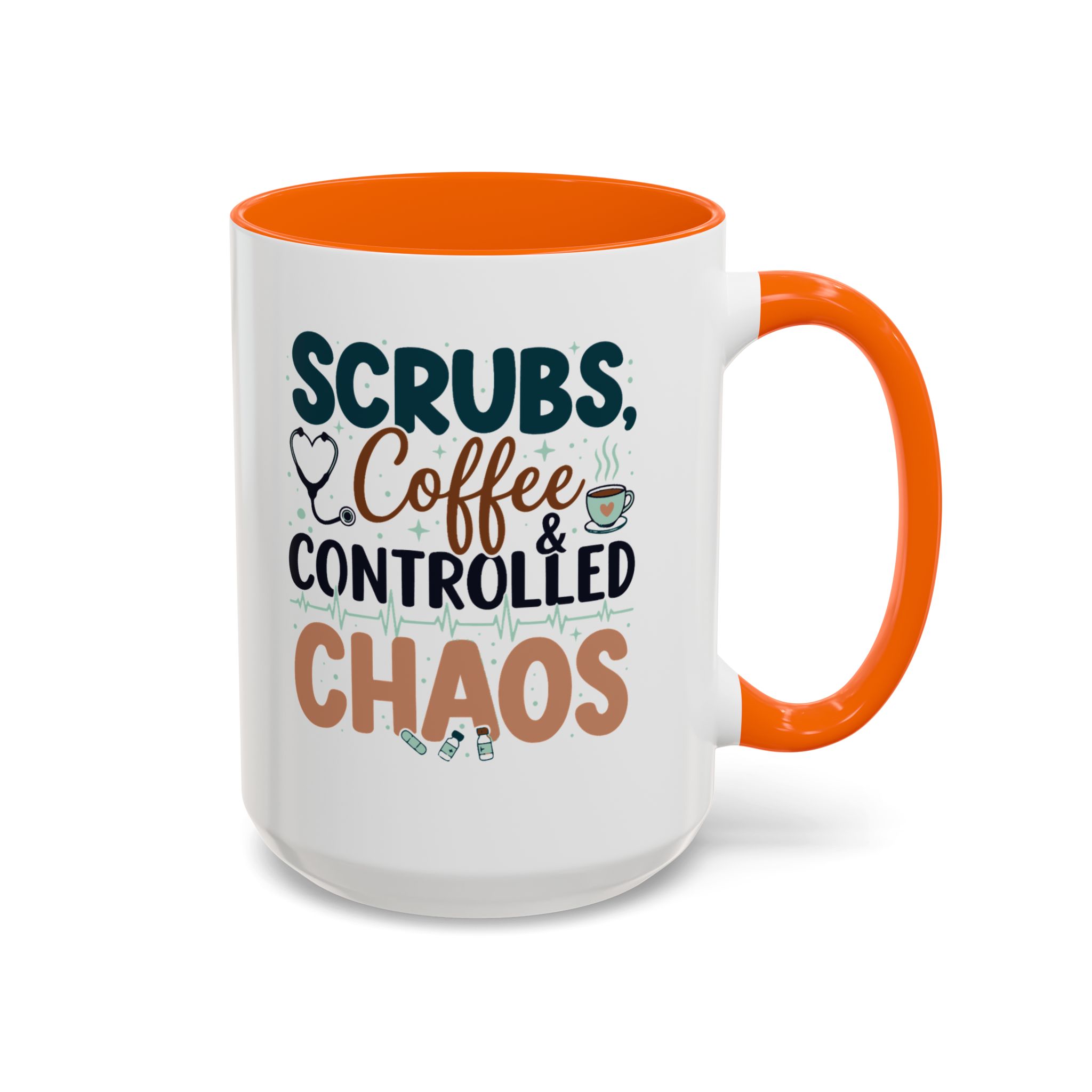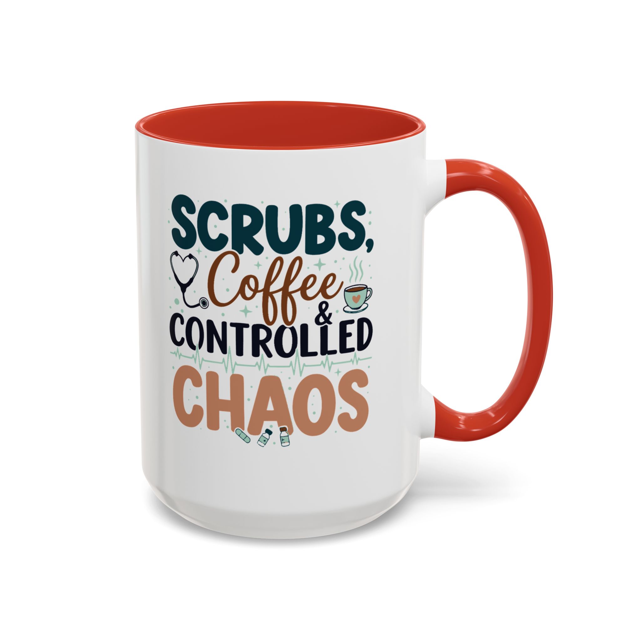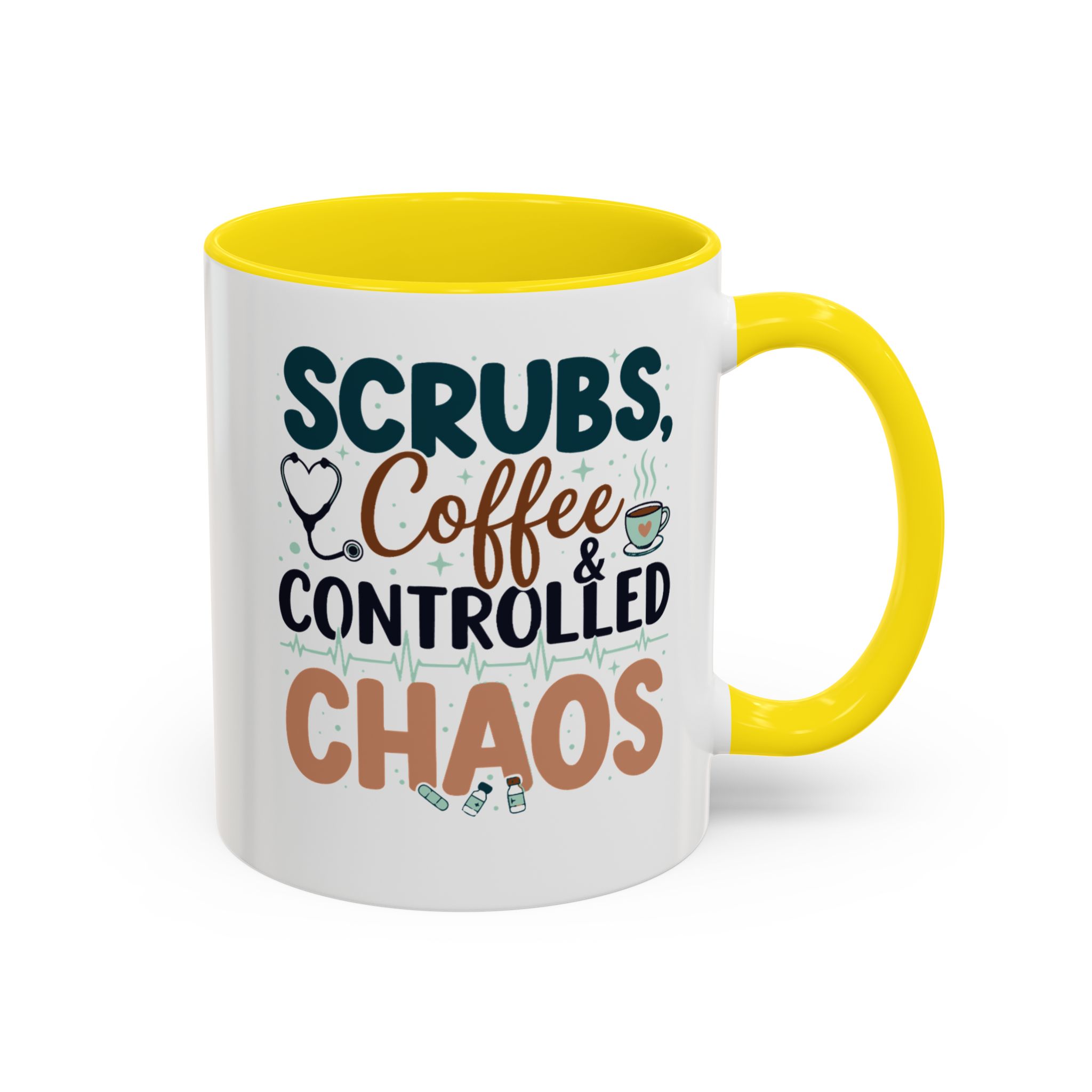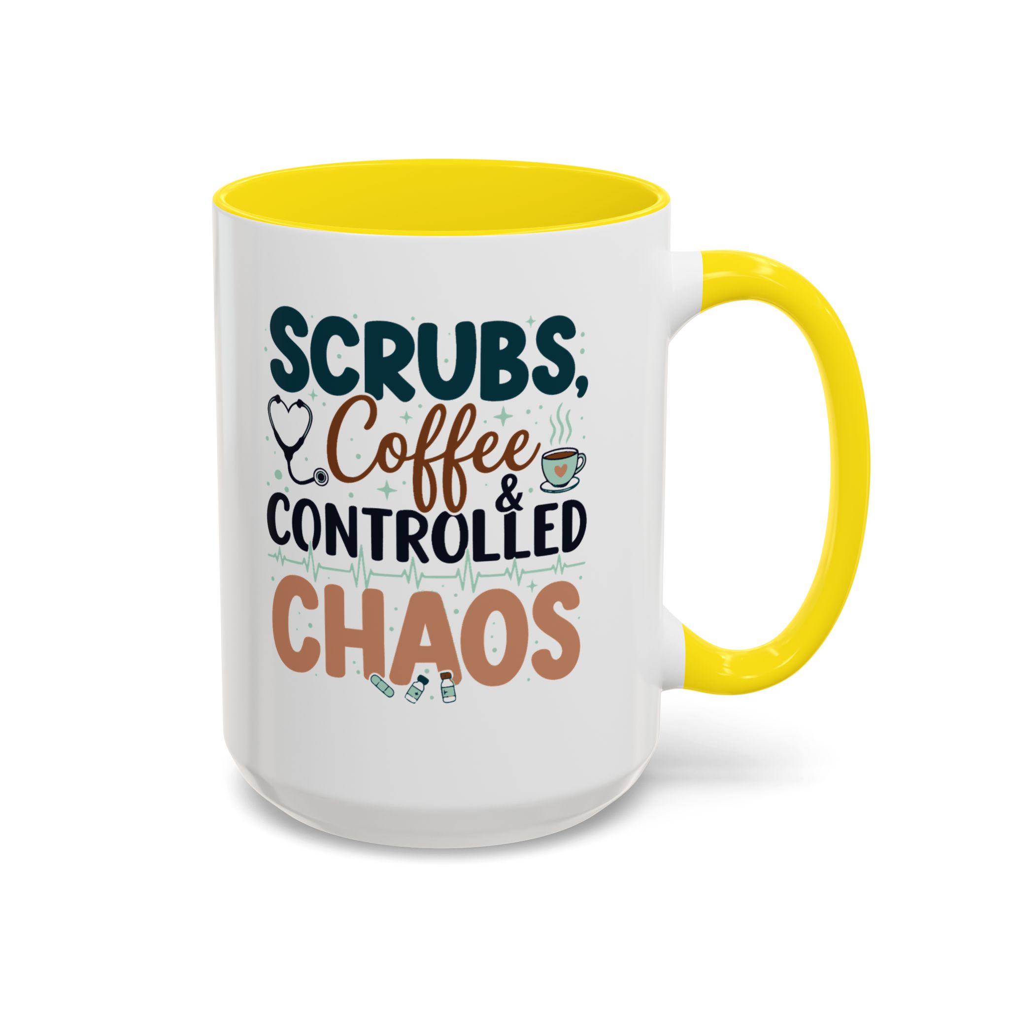 Morning chaos, contained. This ceramic mug holds those moments between bleary eyes and the first steady sip—lively, a little loud, and oddly comforting. The bold color contrast between the white exterior and the colored interior and handle feels like a wink on a hectic shift, an accessory that stands up to repeated use while keeping its pop. It fits into scrubs pockets between rounds, waits patiently on nurse stations, and brings a small, bright pause to breakroom conversations during overnight calls or early shifts. The glossy finish and crisp, vibrant print keep the design readable through countless washes, and the generous 11 oz or 15 oz options mean you can choose a short, strong dose of caffeine or a longer, slow-sip rescue. Safe for microwave and dishwasher, lead- and BPA-free—this mug is built to handle the controlled chaos of clinical life without fuss.