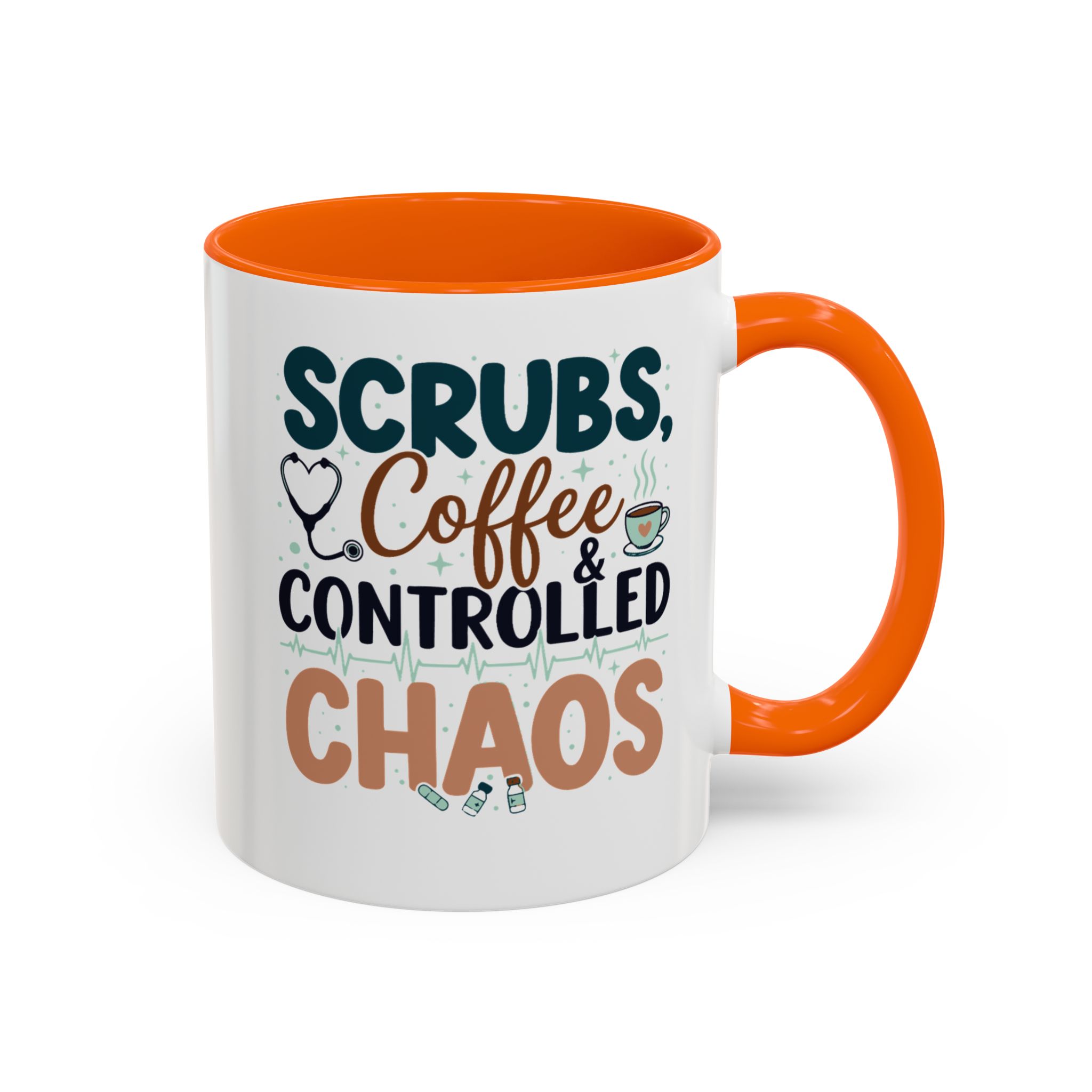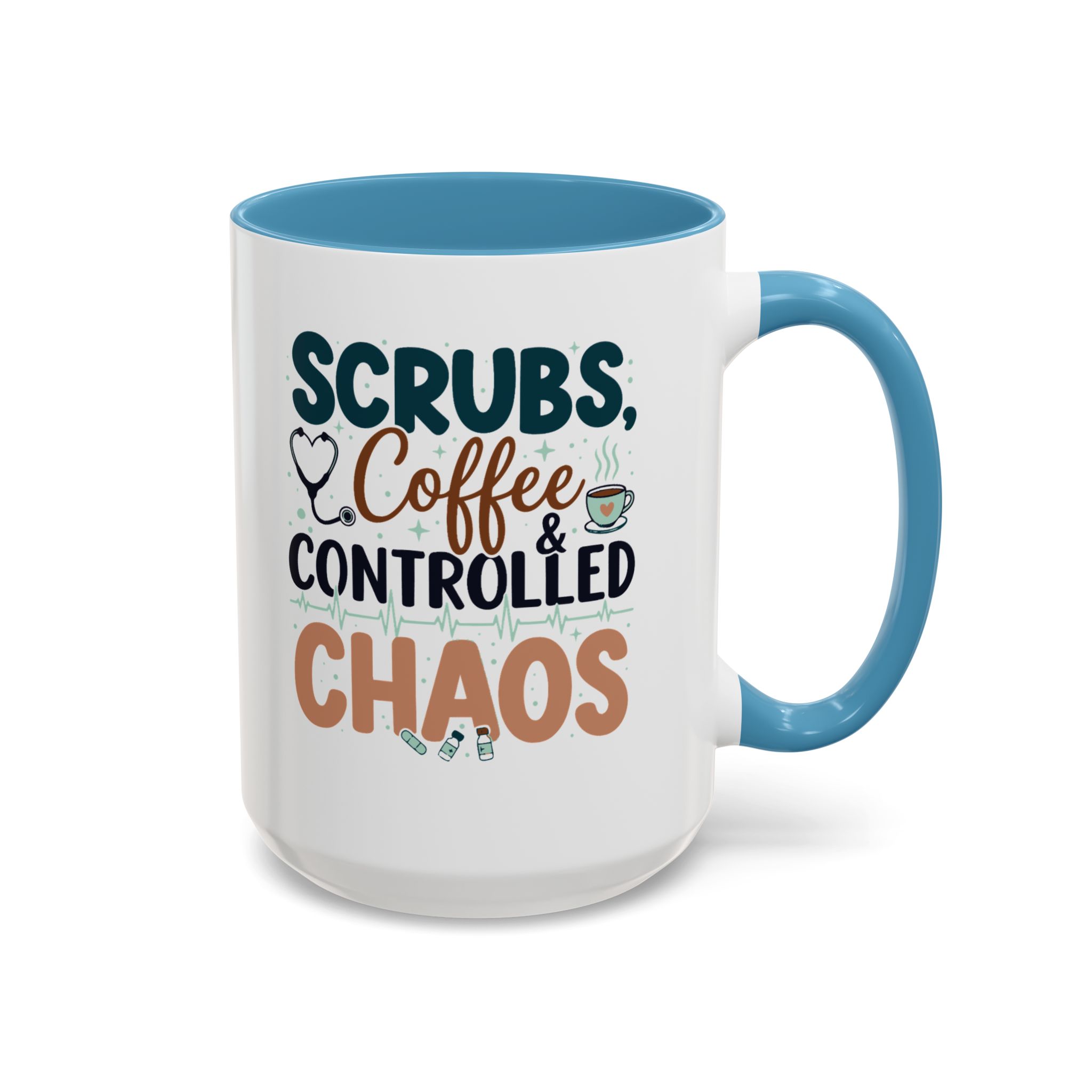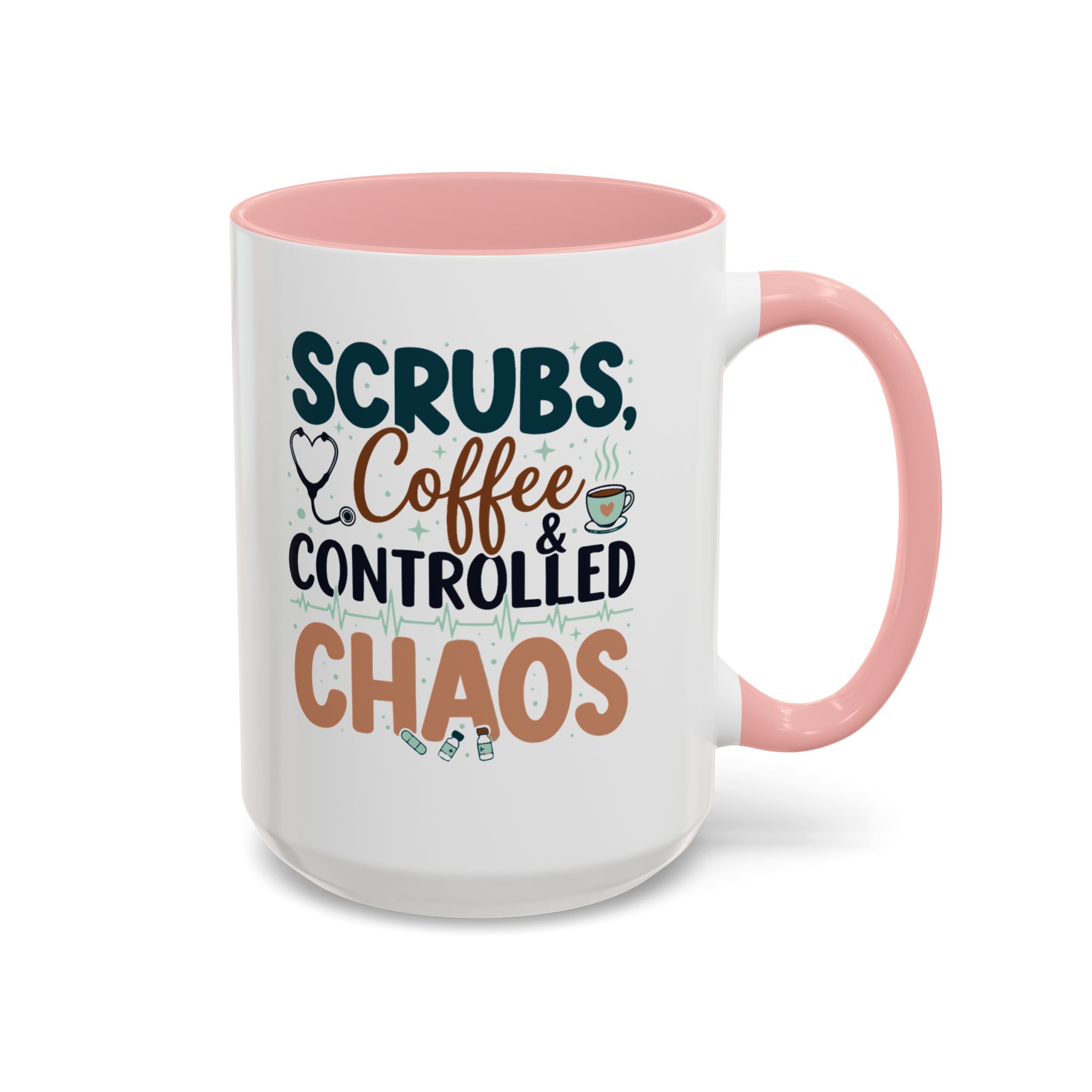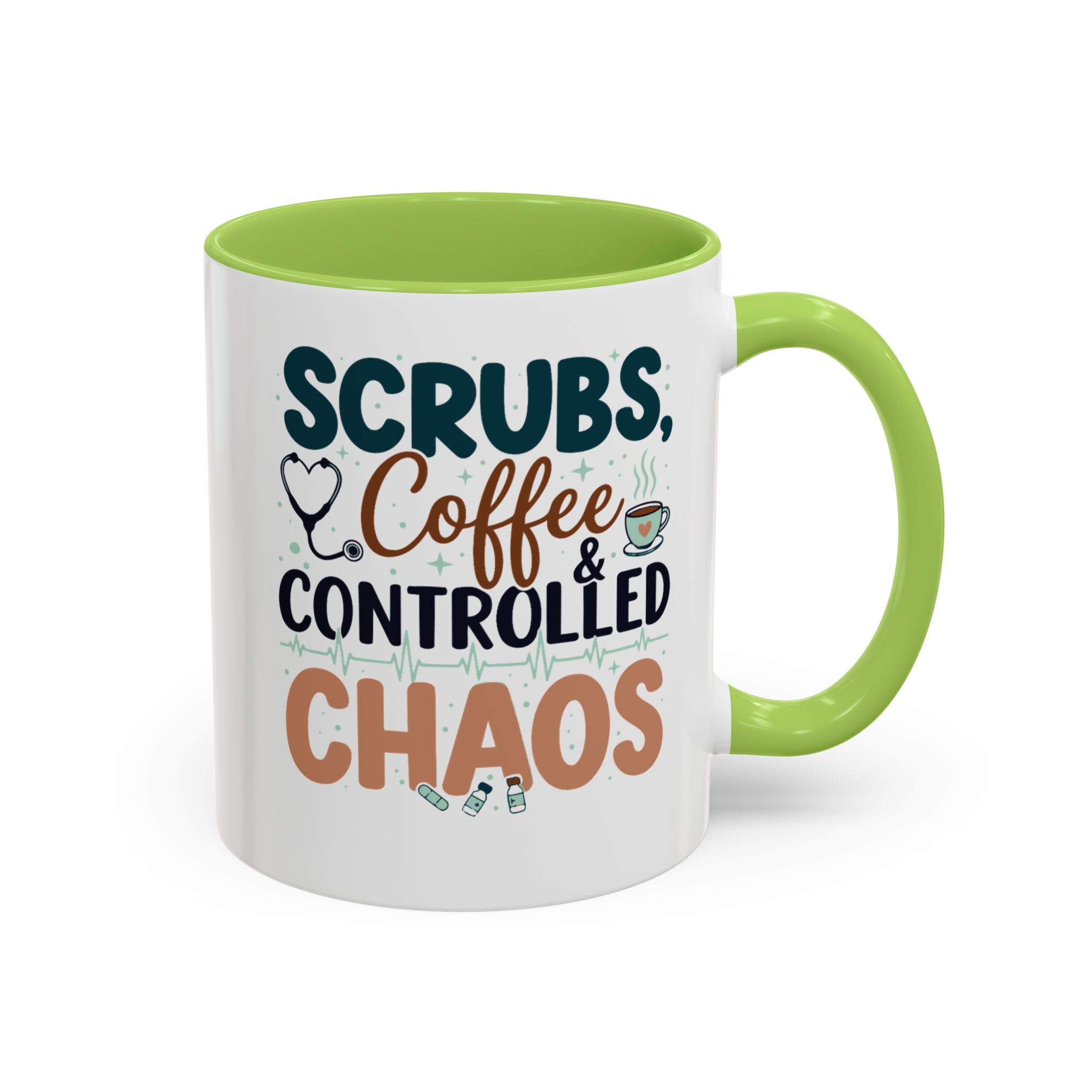 Morning chaos, contained. This ceramic mug holds those moments between bleary eyes and the first steady sip—lively, a little loud, and oddly comforting. The bold color contrast between the white exterior and the colored interior and handle feels like a wink on a hectic shift, an accessory that stands up to repeated use while keeping its pop. It fits into scrubs pockets between rounds, waits patiently on nurse stations, and brings a small, bright pause to breakroom conversations during overnight calls or early shifts. The glossy finish and crisp, vibrant print keep the design readable through countless washes, and the generous 11 oz or 15 oz options mean you can choose a short, strong dose of caffeine or a longer, slow-sip rescue. Safe for microwave and dishwasher, lead- and BPA-free—this mug is built to handle the controlled chaos of clinical life without fuss.