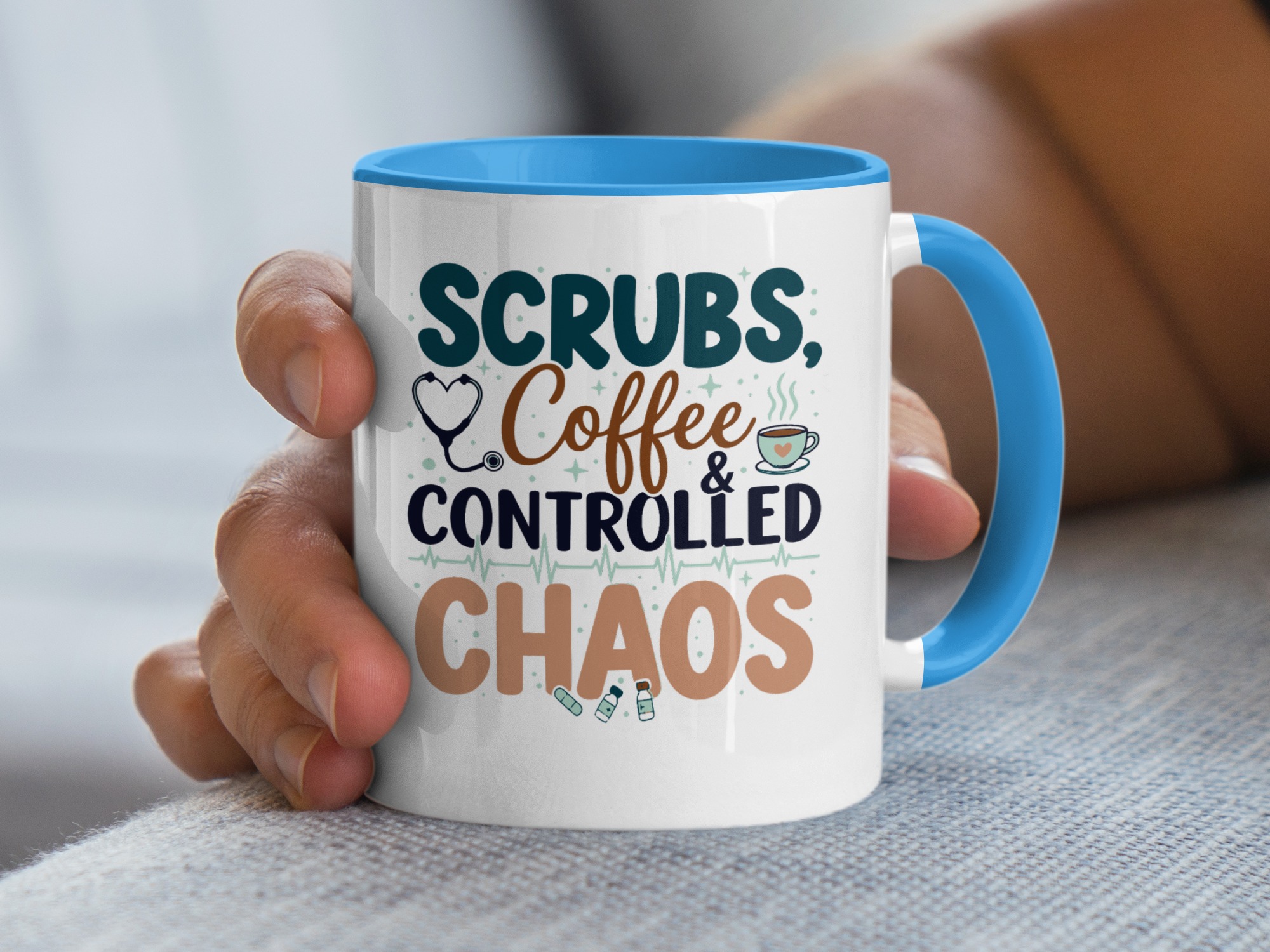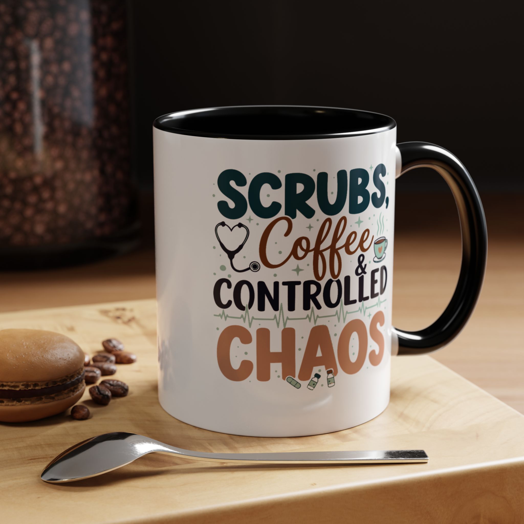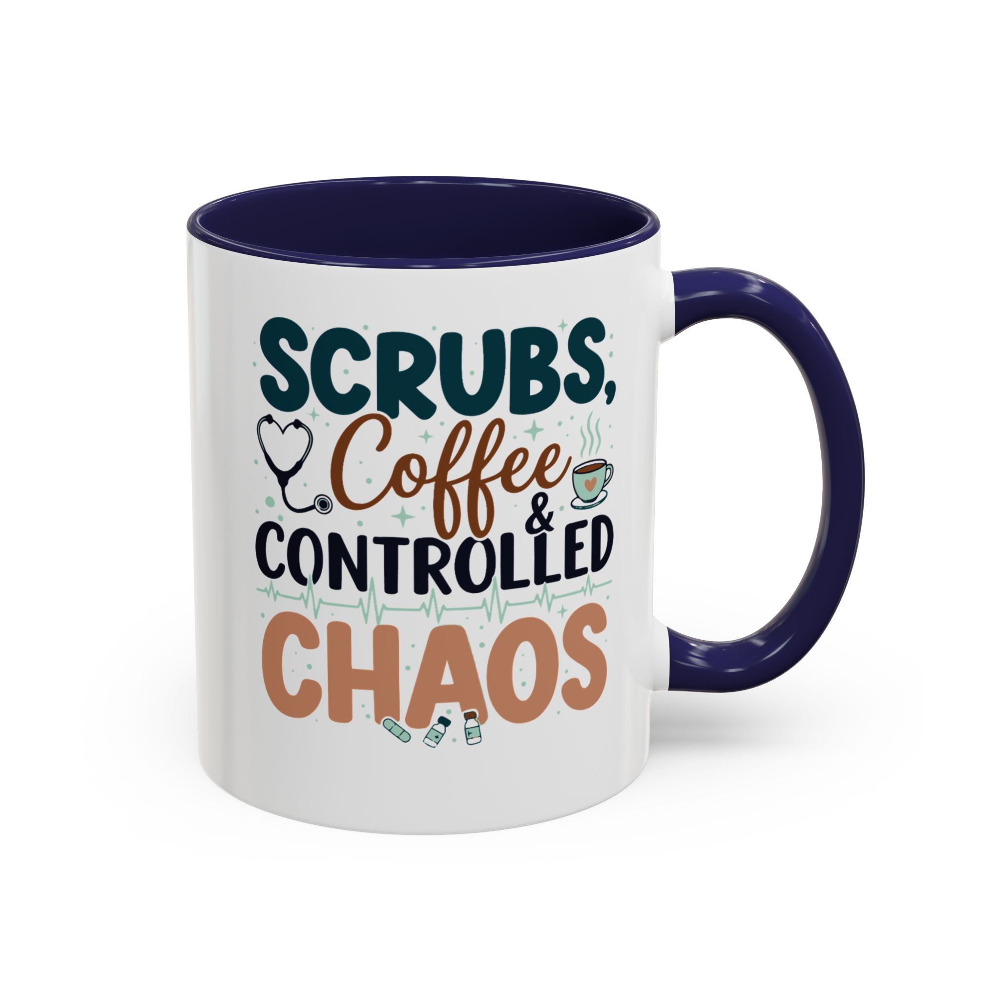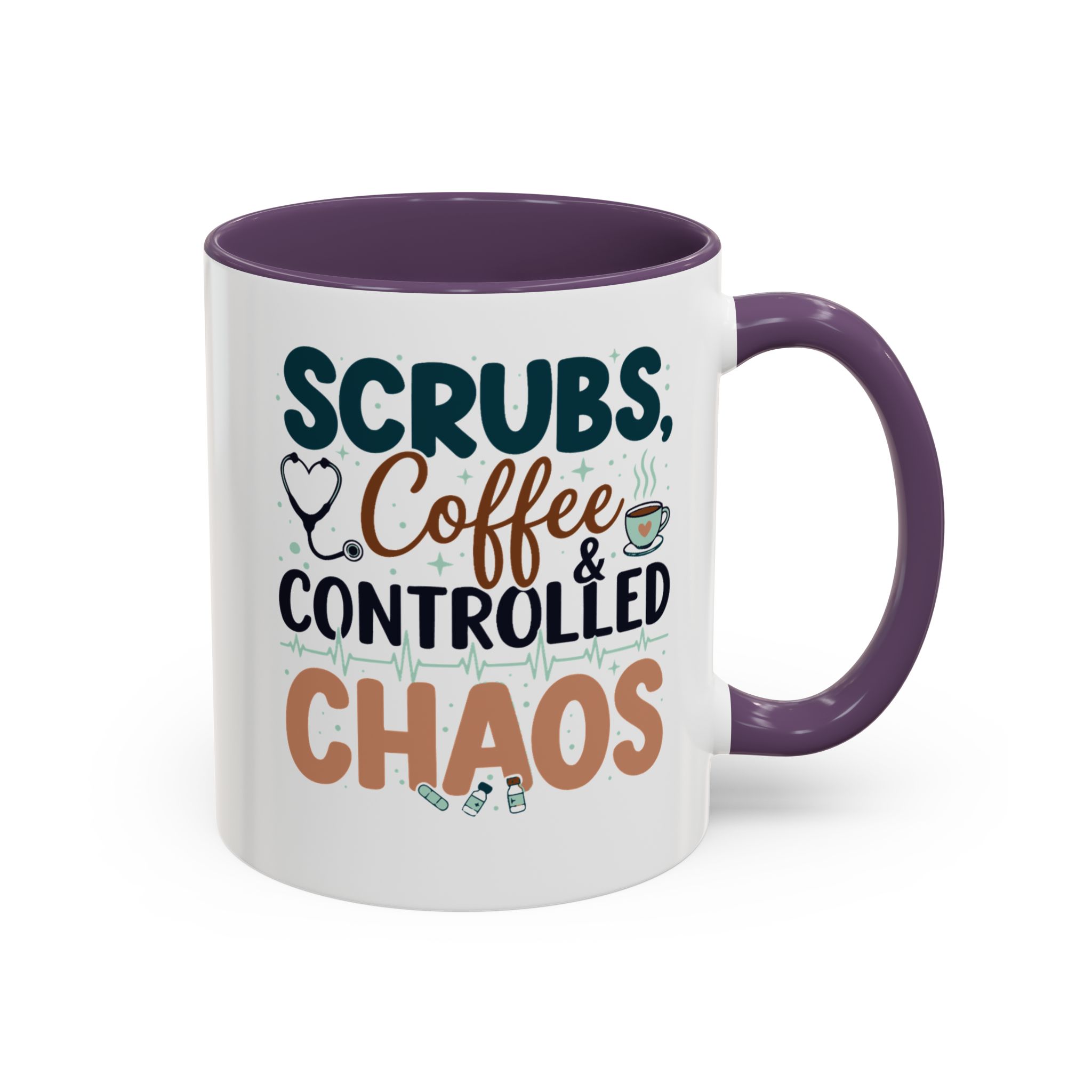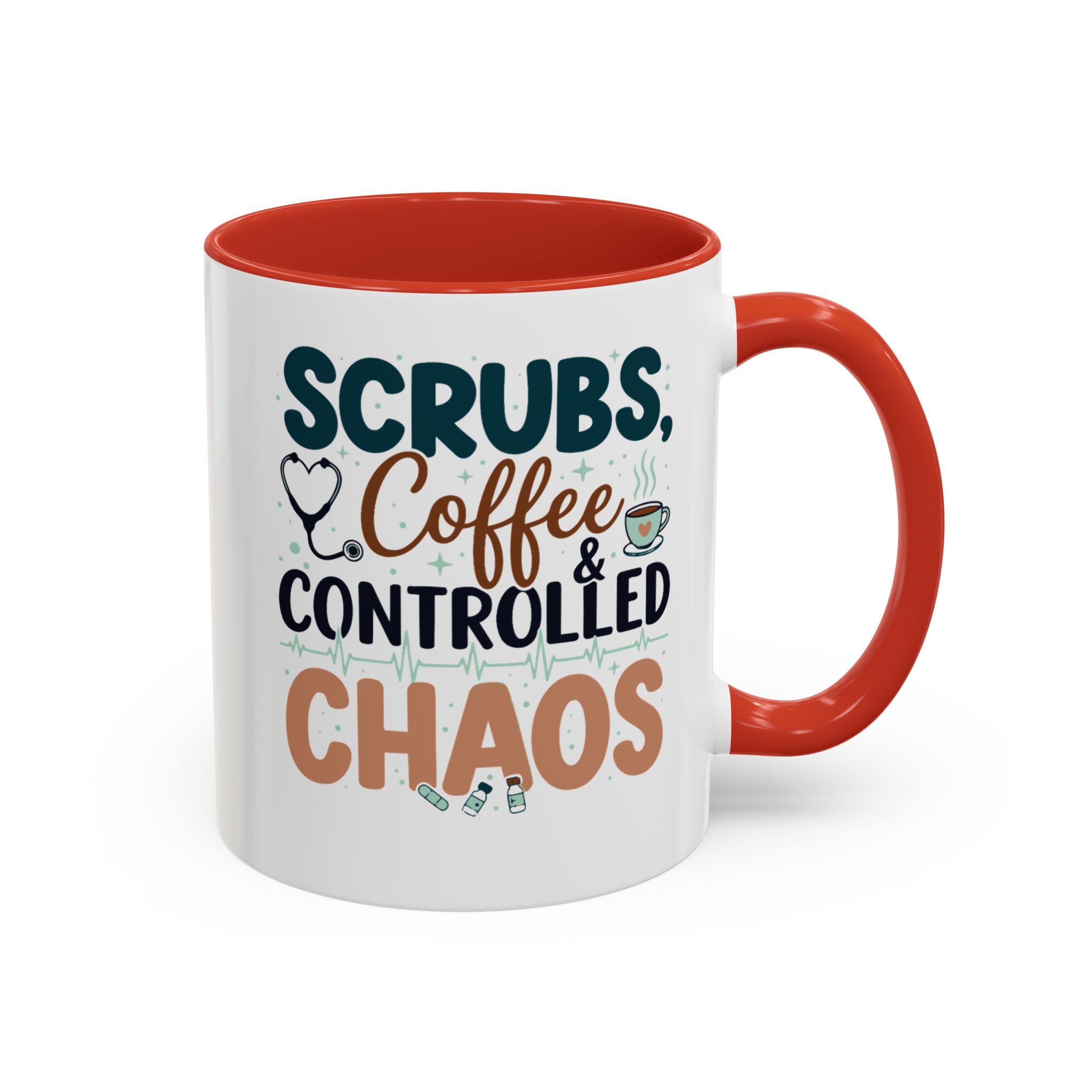 Morning chaos, contained. This ceramic mug holds those moments between bleary eyes and the first steady sip—lively, a little loud, and oddly comforting. The bold color contrast between the white exterior and the colored interior and handle feels like a wink on a hectic shift, an accessory that stands up to repeated use while keeping its pop. It fits into scrubs pockets between rounds, waits patiently on nurse stations, and brings a small, bright pause to breakroom conversations during overnight calls or early shifts. The glossy finish and crisp, vibrant print keep the design readable through countless washes, and the generous 11 oz or 15 oz options mean you can choose a short, strong dose of caffeine or a longer, slow-sip rescue. Safe for microwave and dishwasher, lead- and BPA-free—this mug is built to handle the controlled chaos of clinical life without fuss.
