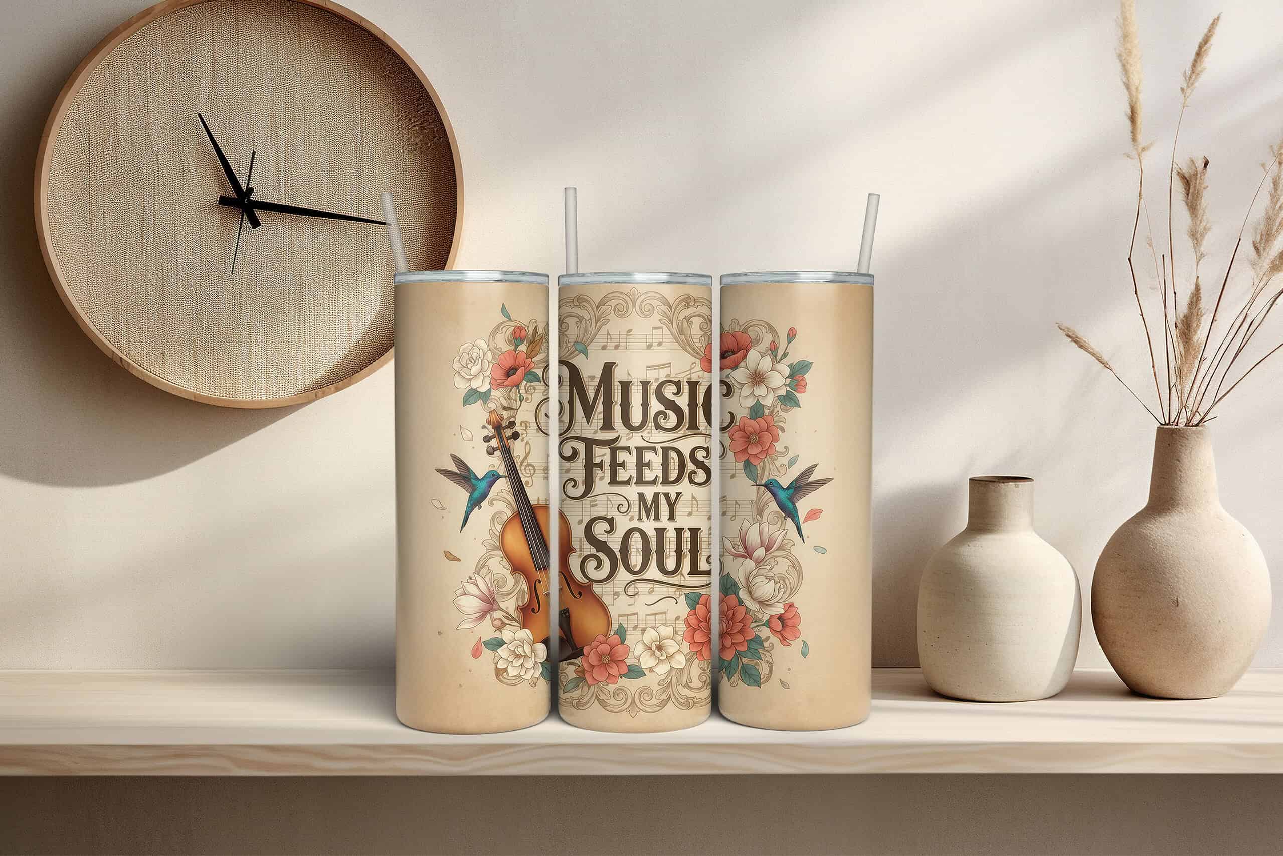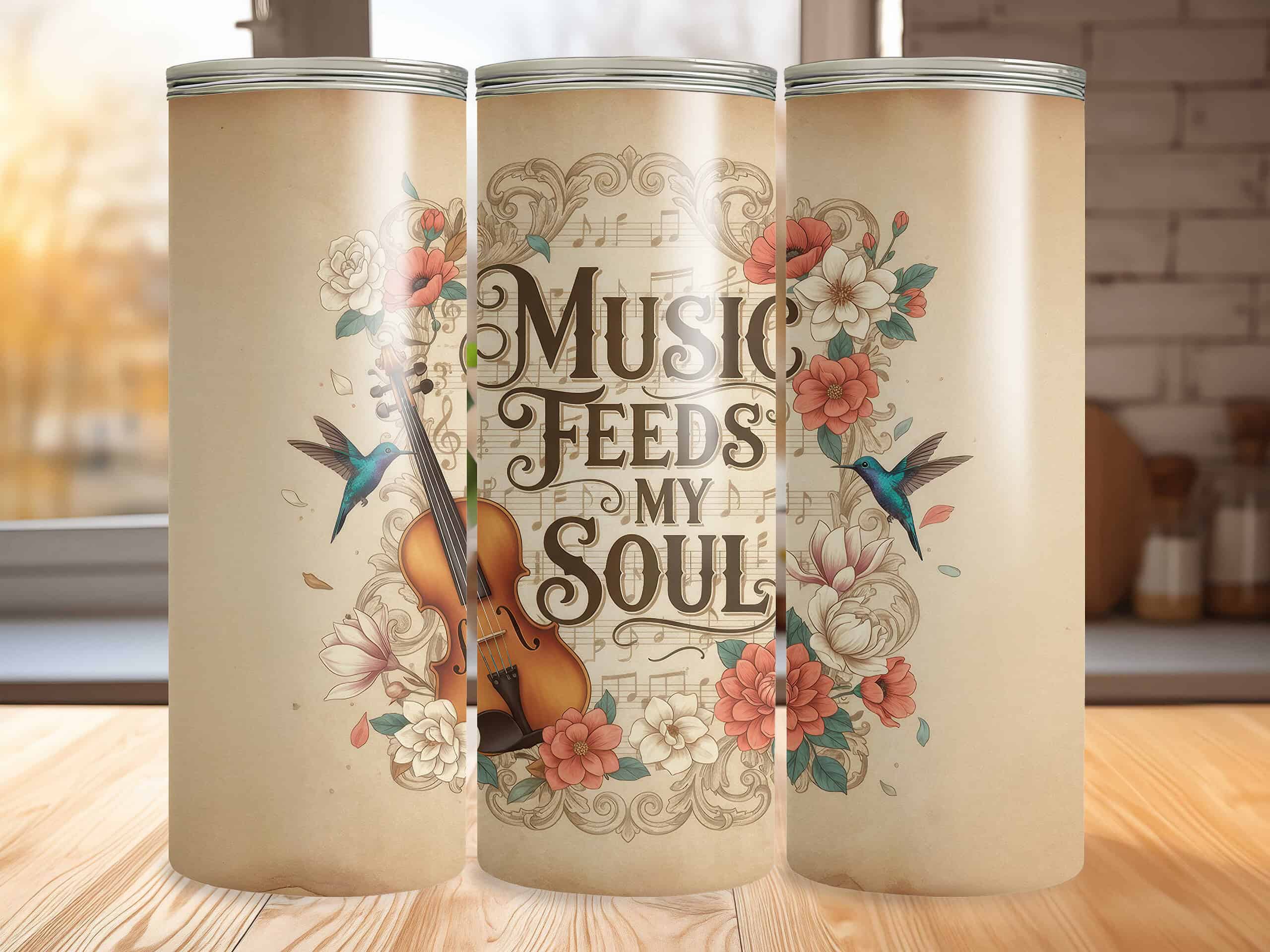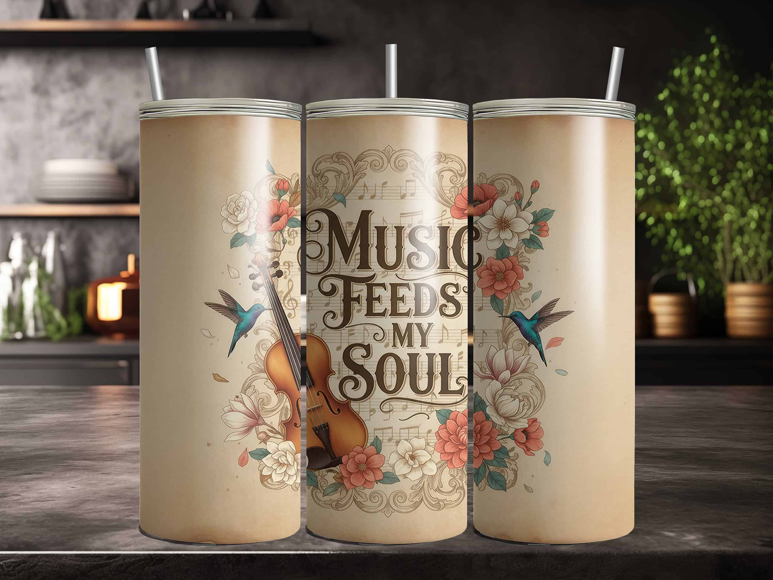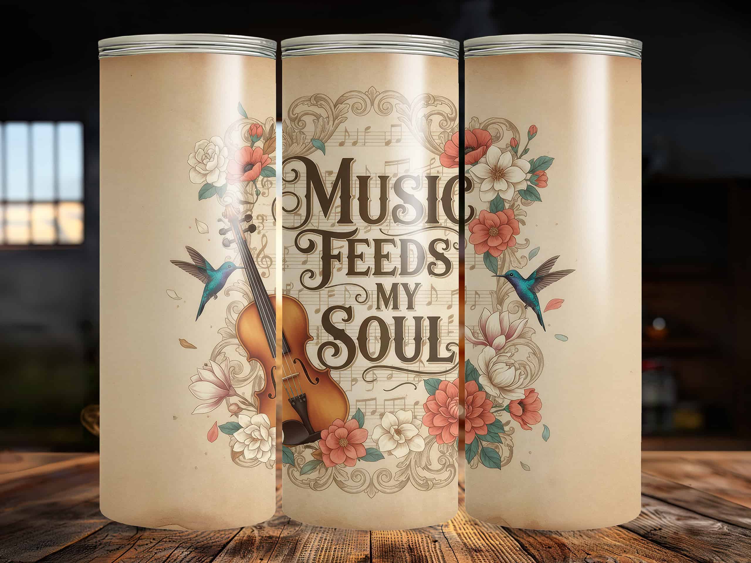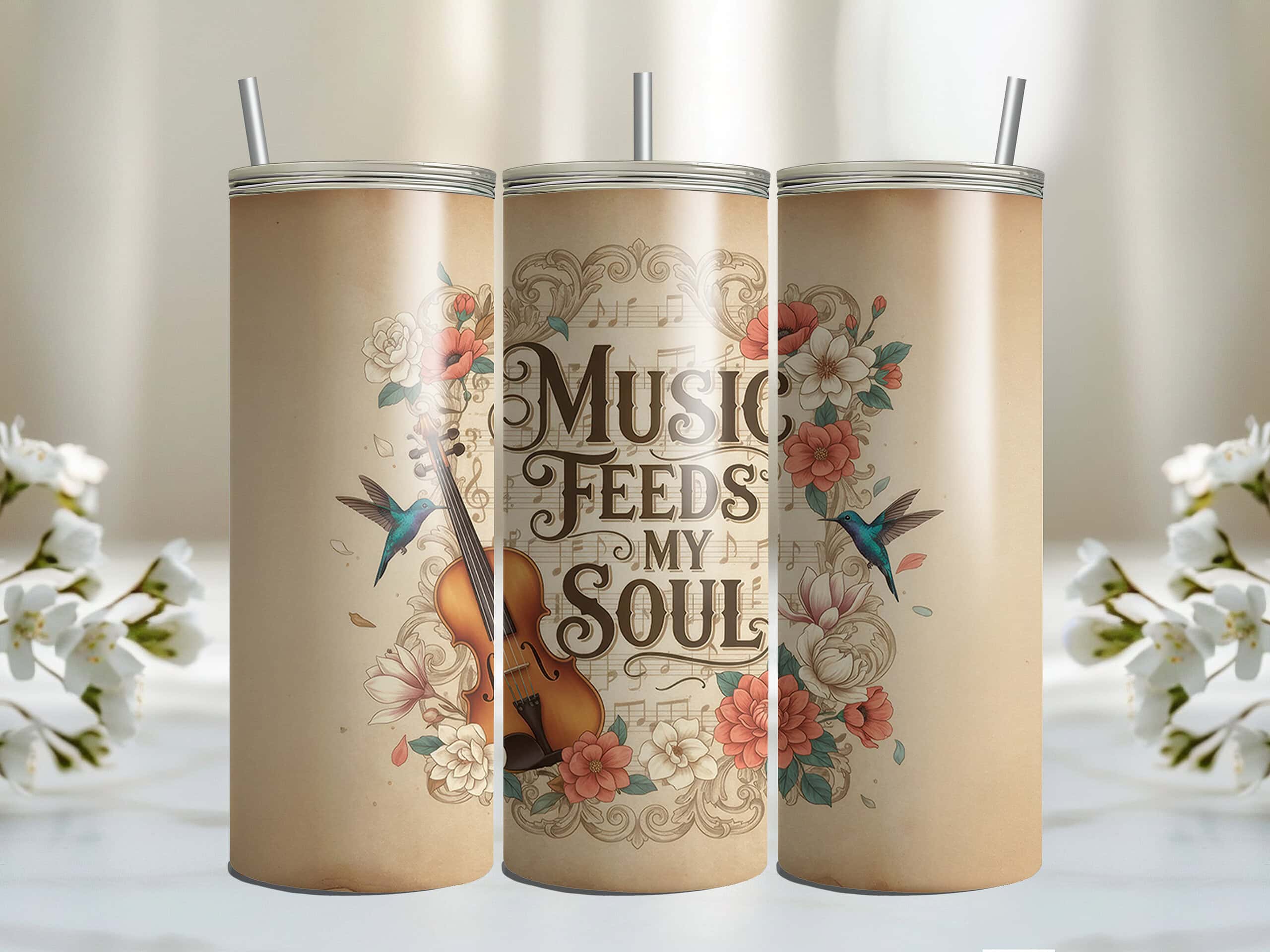 Elegant 20oz sublimation tumbler featuring the quote “Music Feeds My Soul” framed by a vintage violin, soft florals and colorful hummingbirds on a parchment-style background. A perfect everyday drink cup for music lovers, musicians, and anyone who feels inspired by beautiful melodies.