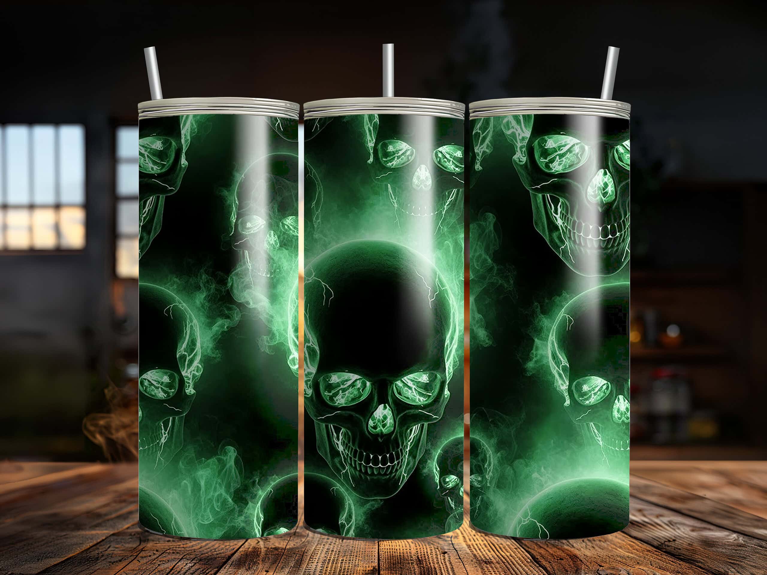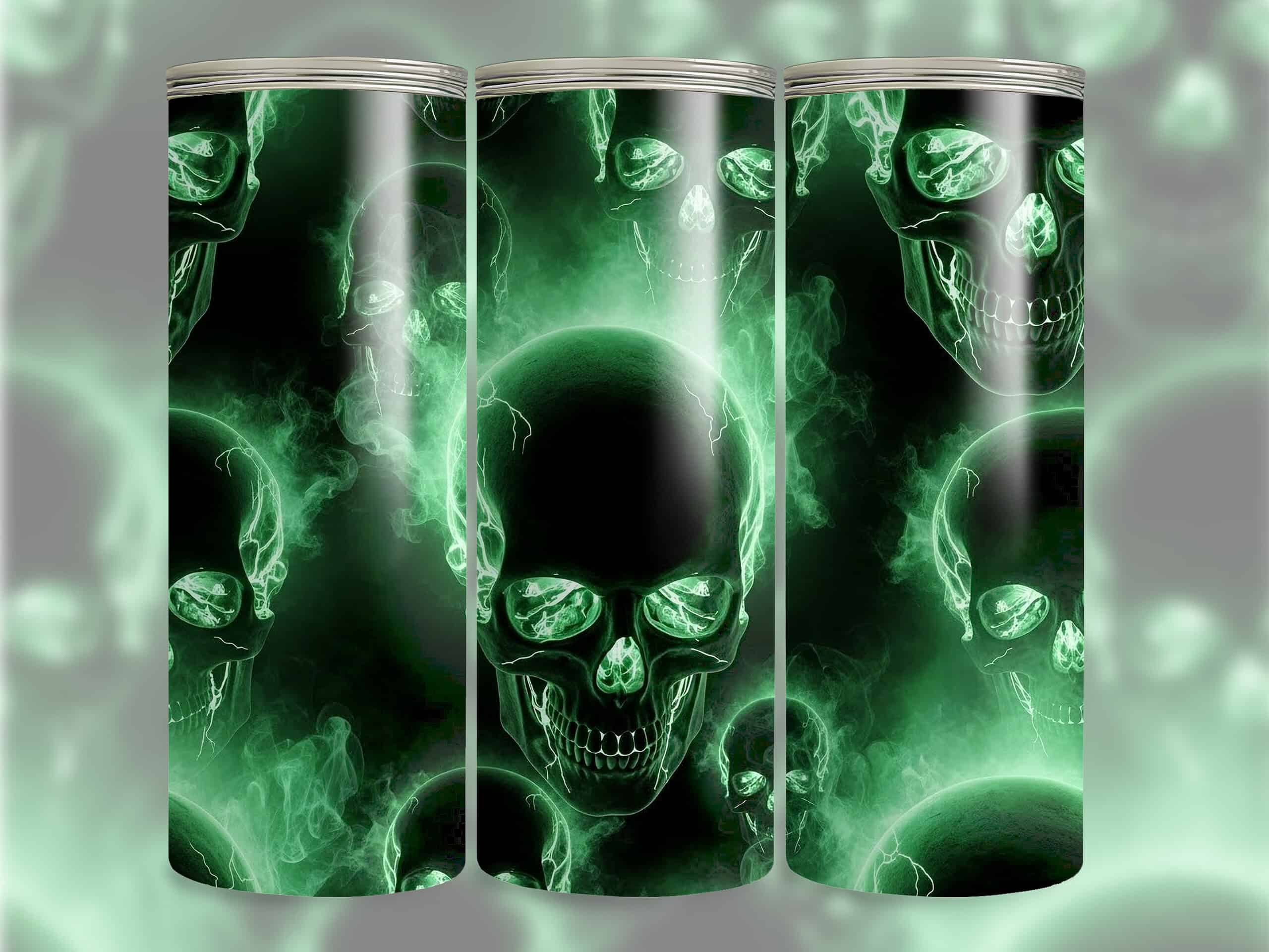 Turn every sip into a statement with this Glowing Green Skulls 20oz Sublimation Tumbler. The design features a seamless pattern of eerie neon-green skulls surrounded by swirling smoke on a deep black backdrop. Electric highlights and crackling light effects make the skulls look like they’re lit from within, giving the tumbler an intense, high-energy horror vibe.