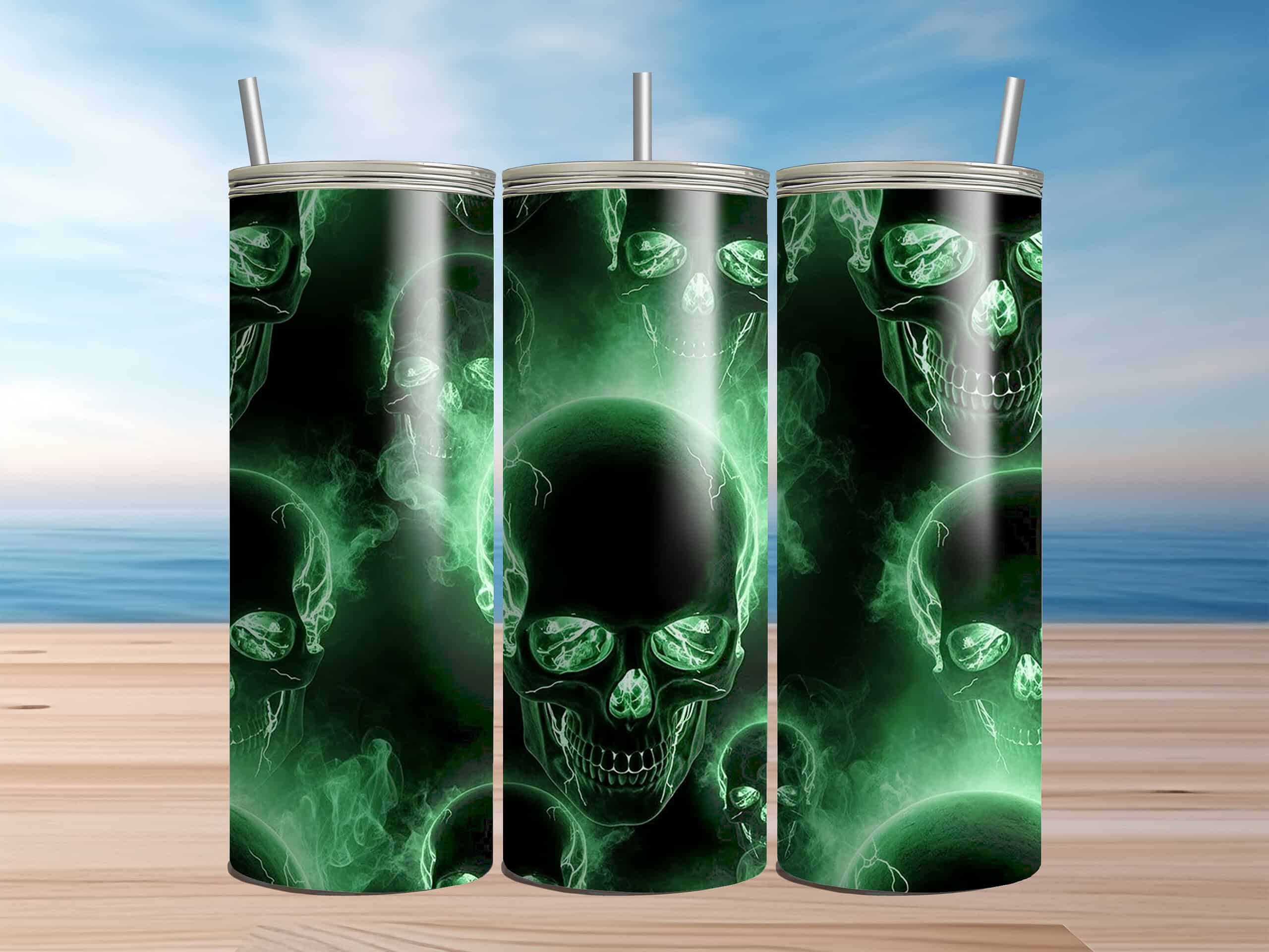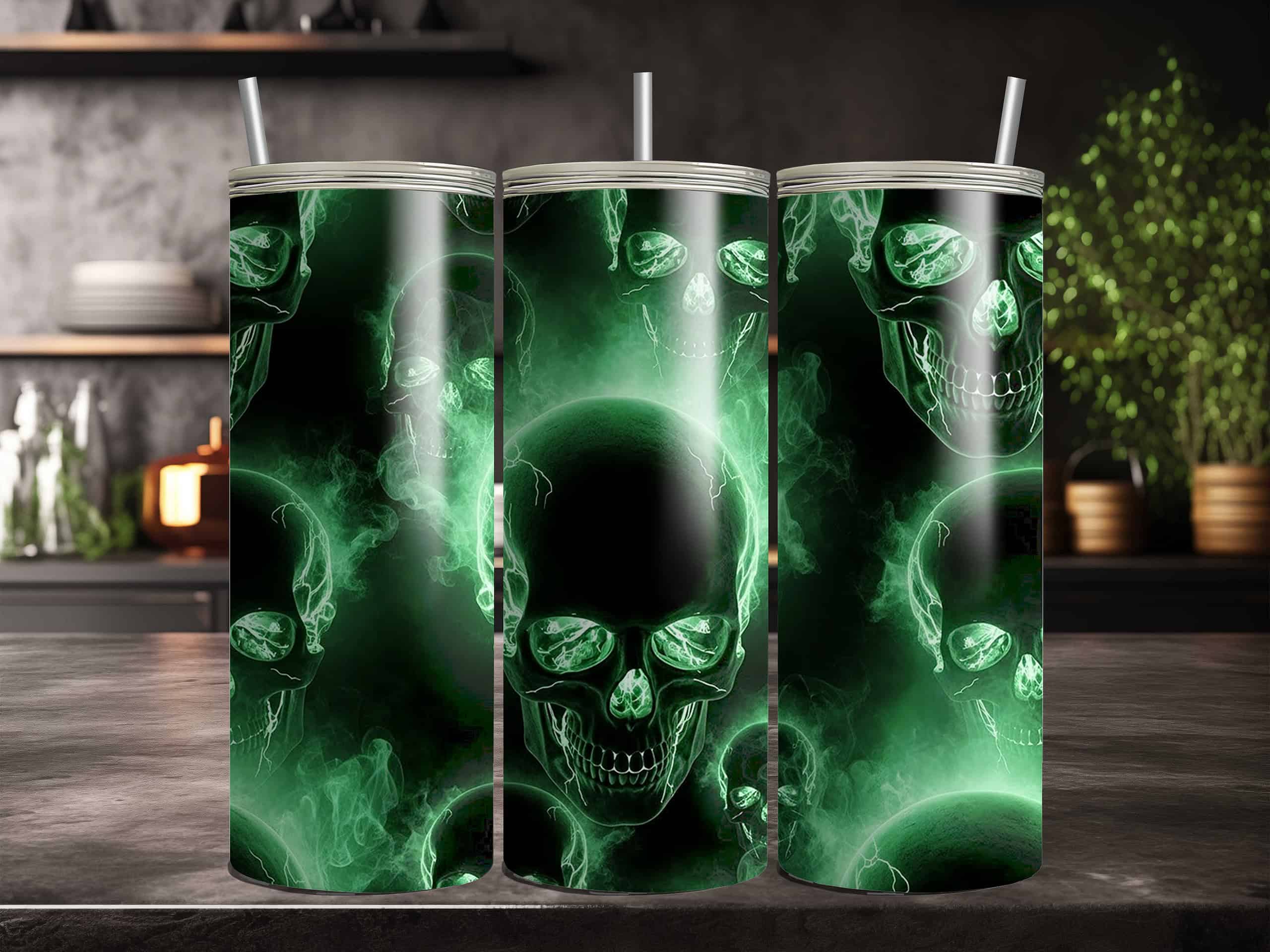 Bring some glowing spooky energy to your everyday routine with this neon green skull 20oz sublimation tumbler.